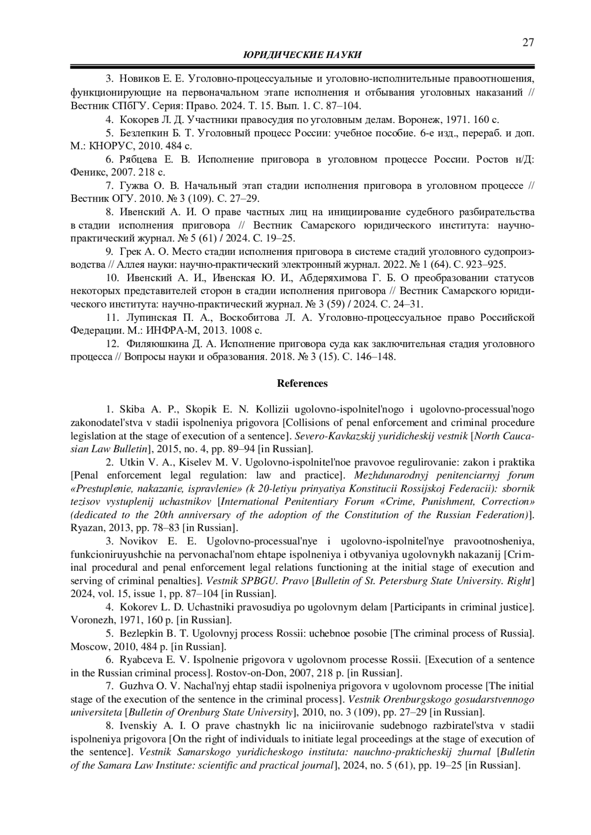 10. Ивенский А. И., Ивенская Ю. И., Абдеряхимова Г. Б. О преобразовании статусов некоторых представителей сторон в стадии исполнения приговора // Вестник Самарского юридического института: научно-практический журнал. № 3 (59) / 2024. С. 24-31.