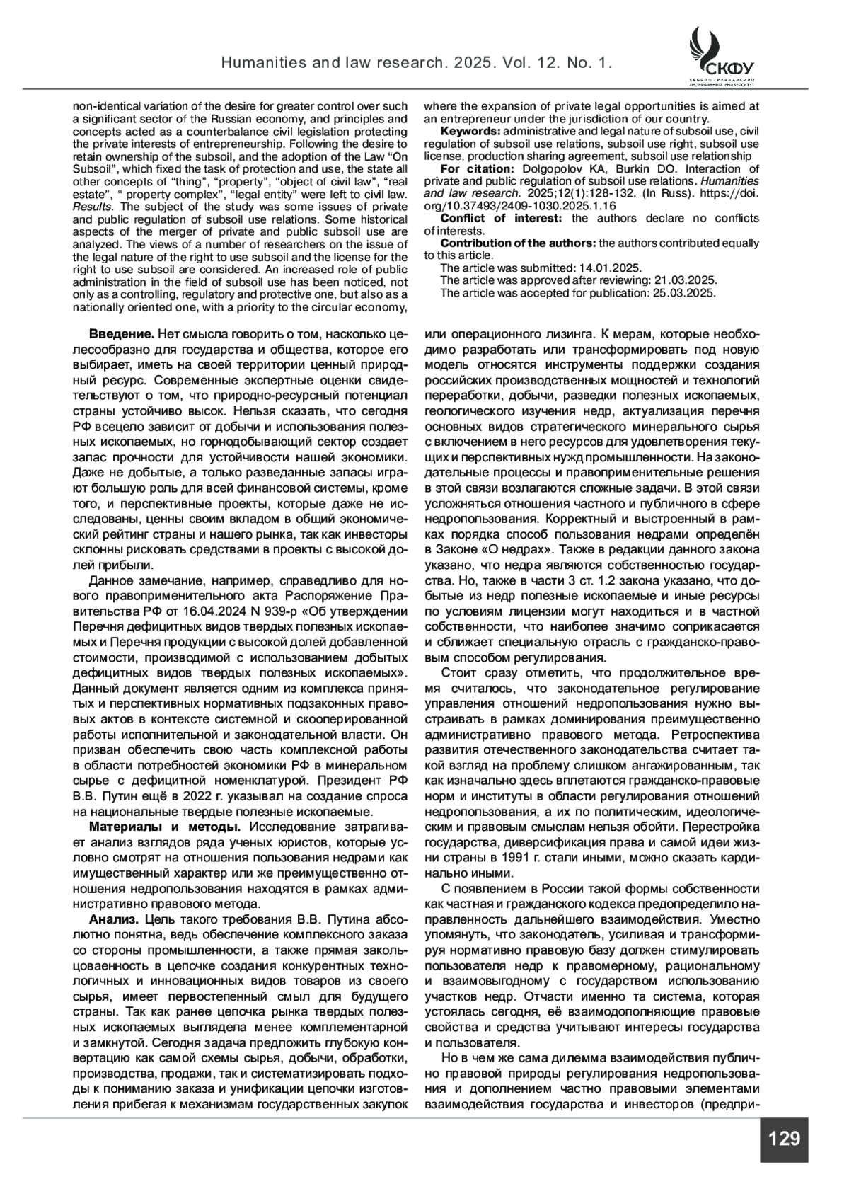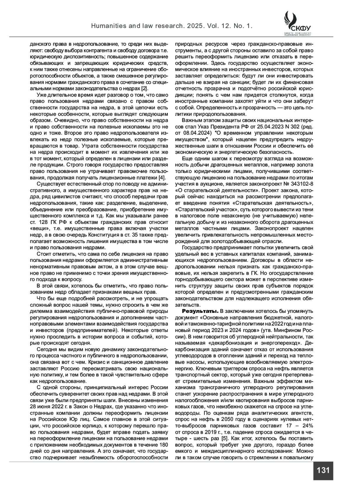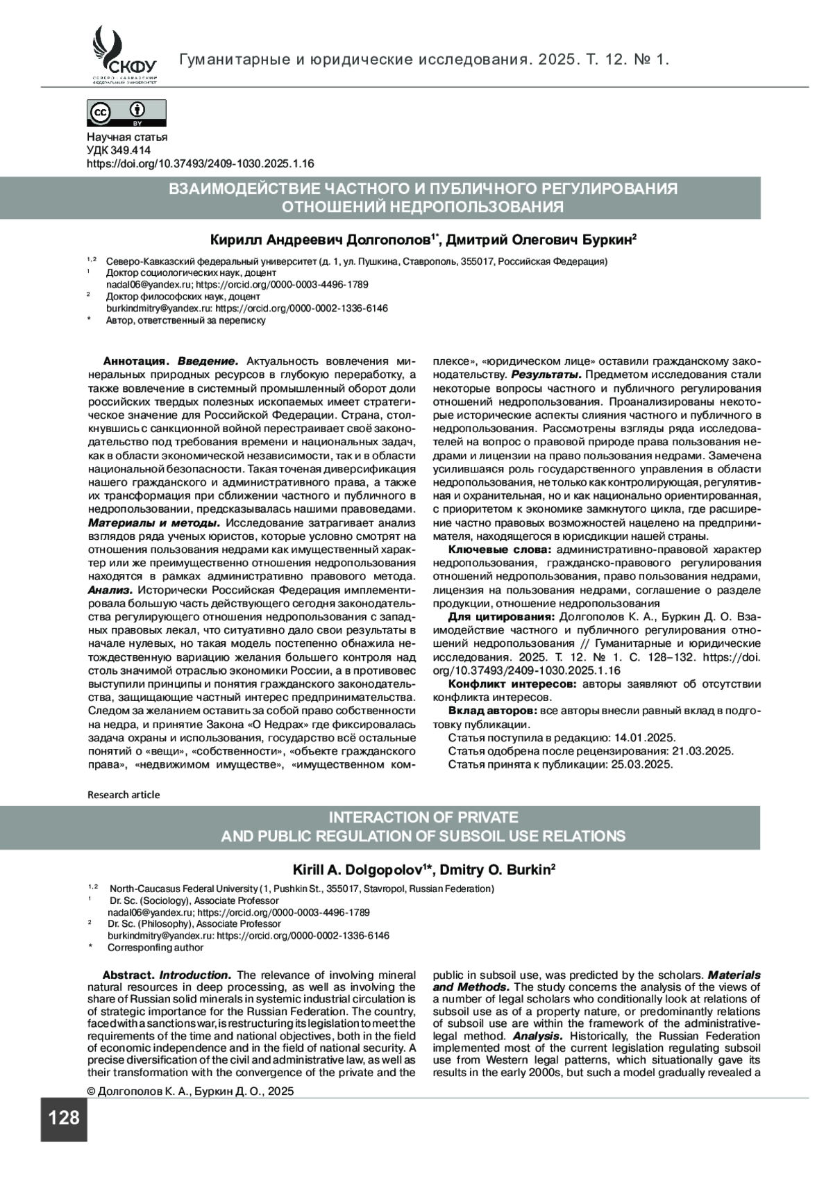 Введение. Актуальность вовлечения минеральных природных ресурсов в глубокую переработку, а также вовлечение в системный промышленный оборот доли российских твердых полезных ископаемых имеет стратегическое значение для Российской Федерации. Страна, столкнувшись с санкционной войной перестраивает своё законодательство под требования времени и национальных задач, как в области экономической независимости, так и в области национальной безопасности. Такая точеная диверсификация нашего гражданского и административного права, а также их трансформация при сближении частного и публичного в недропользовании, предсказывалась нашими правоведами.