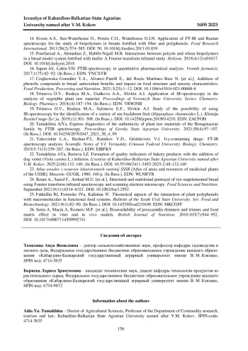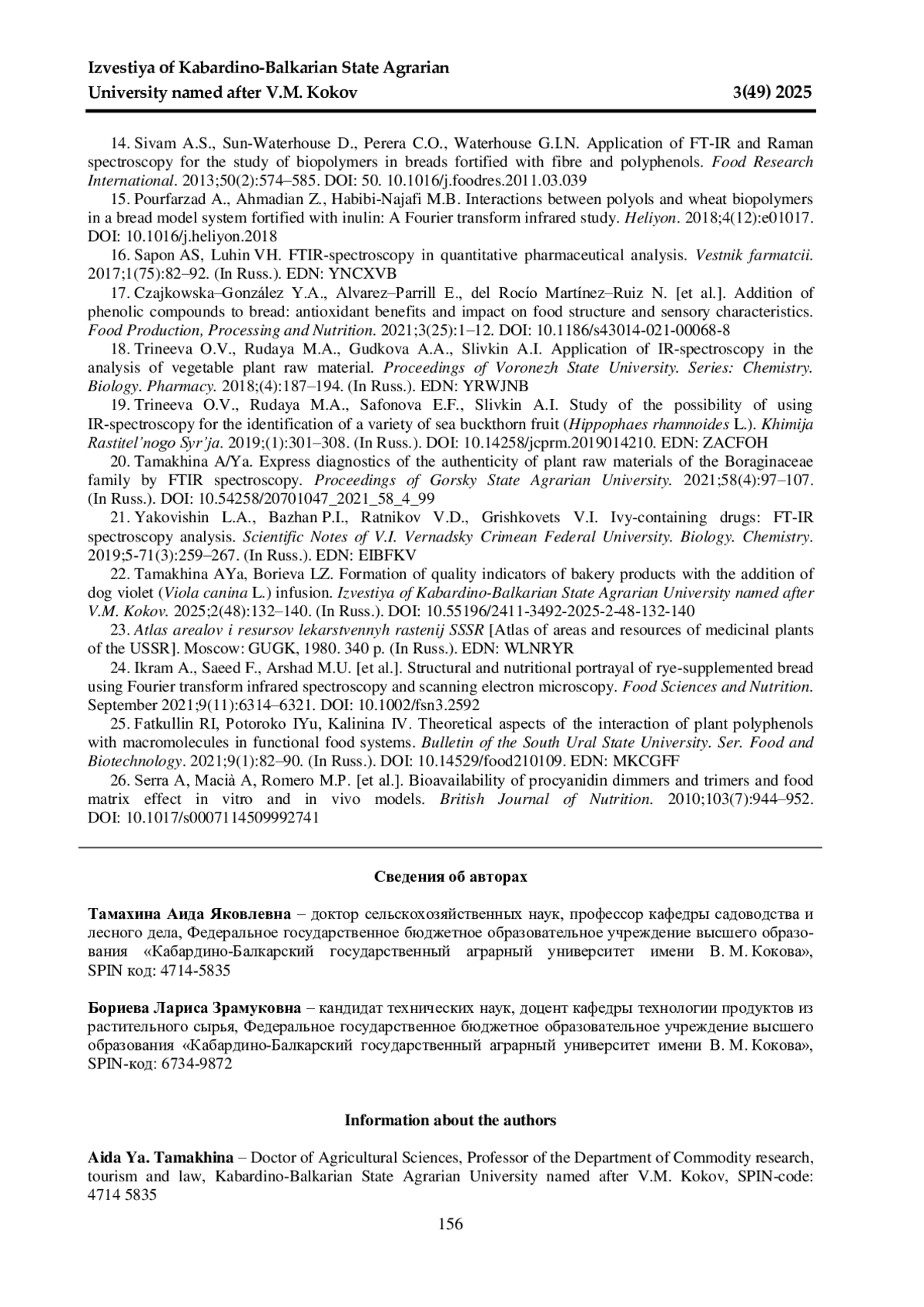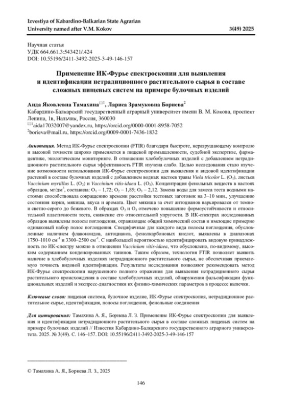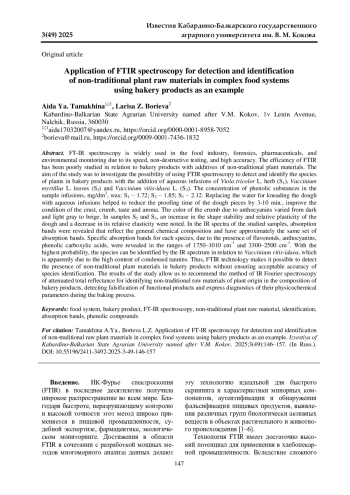 Статья: ПРИМЕНЕНИЕ ИК-ФУРЬЕ СПЕКТРОСКОПИИ ДЛЯ ВЫЯВЛЕНИЯ И ИДЕНТИФИКАЦИИ НЕТРАДИЦИОННОГО РАСТИТЕЛЬНОГО СЫРЬЯ В СОСТАВЕ СЛОЖНЫХ ПИЩЕВЫХ СИСТЕМ НА ПРИМЕРЕ БУЛОЧНЫХ ИЗДЕЛИЙ (2025)