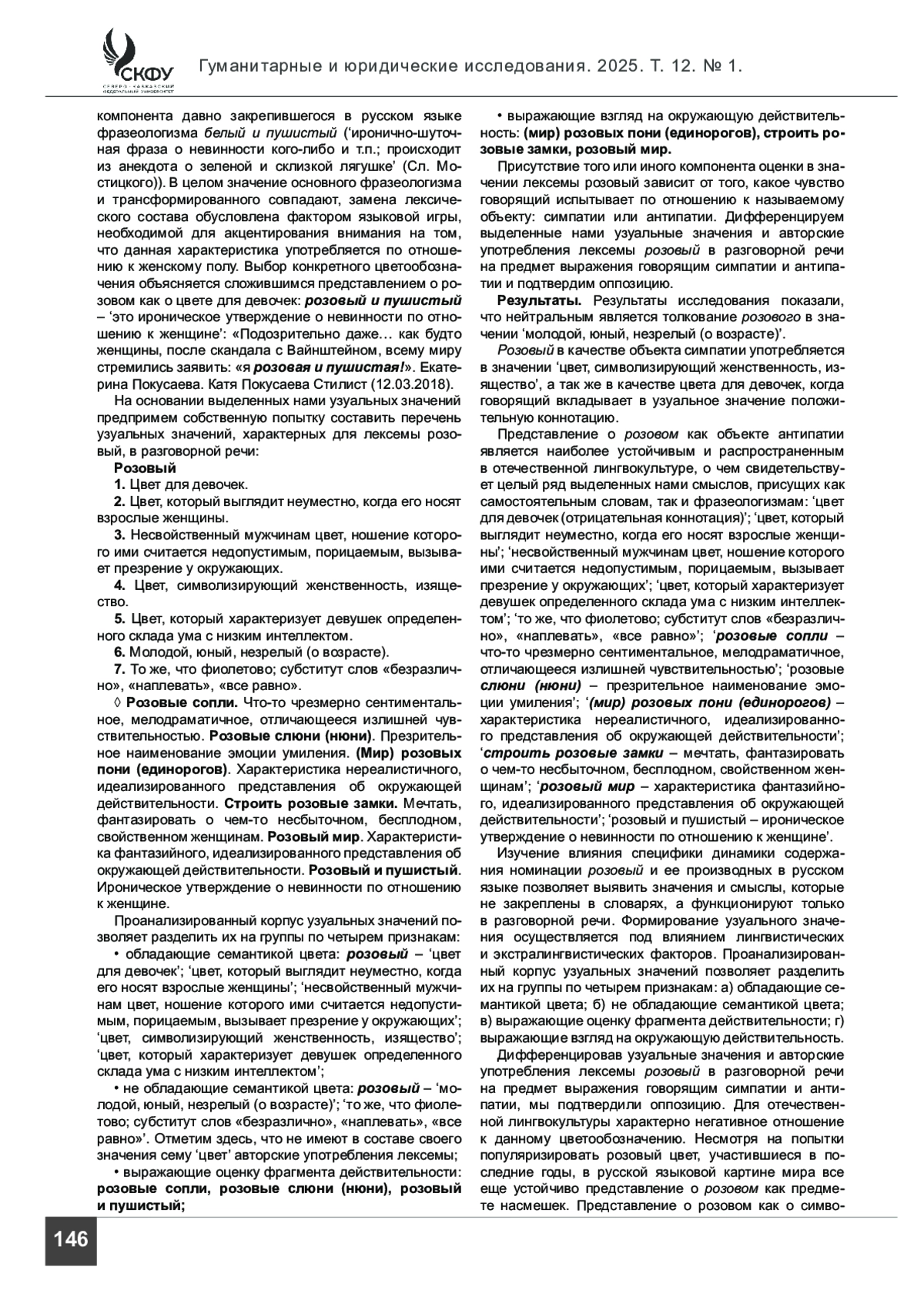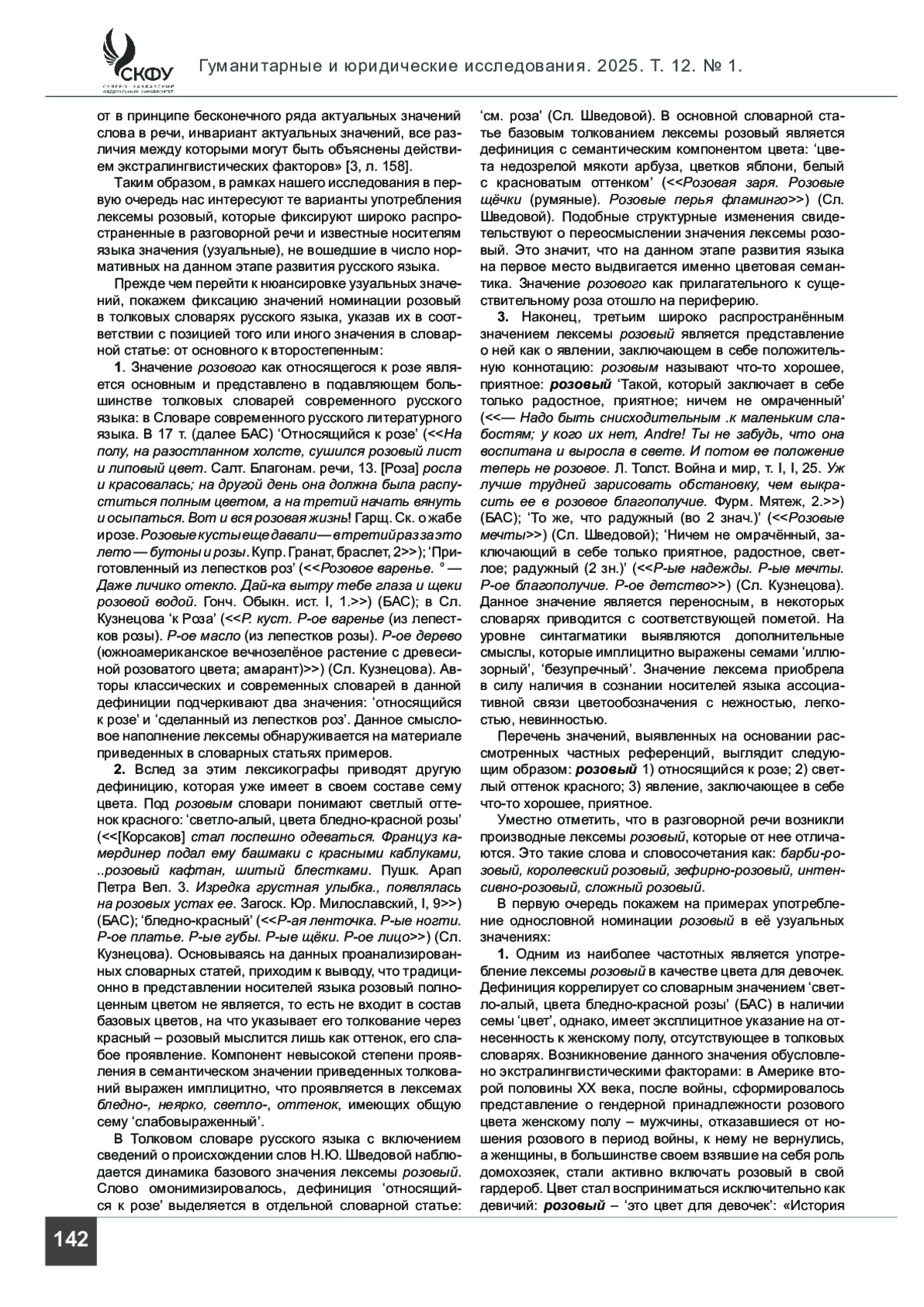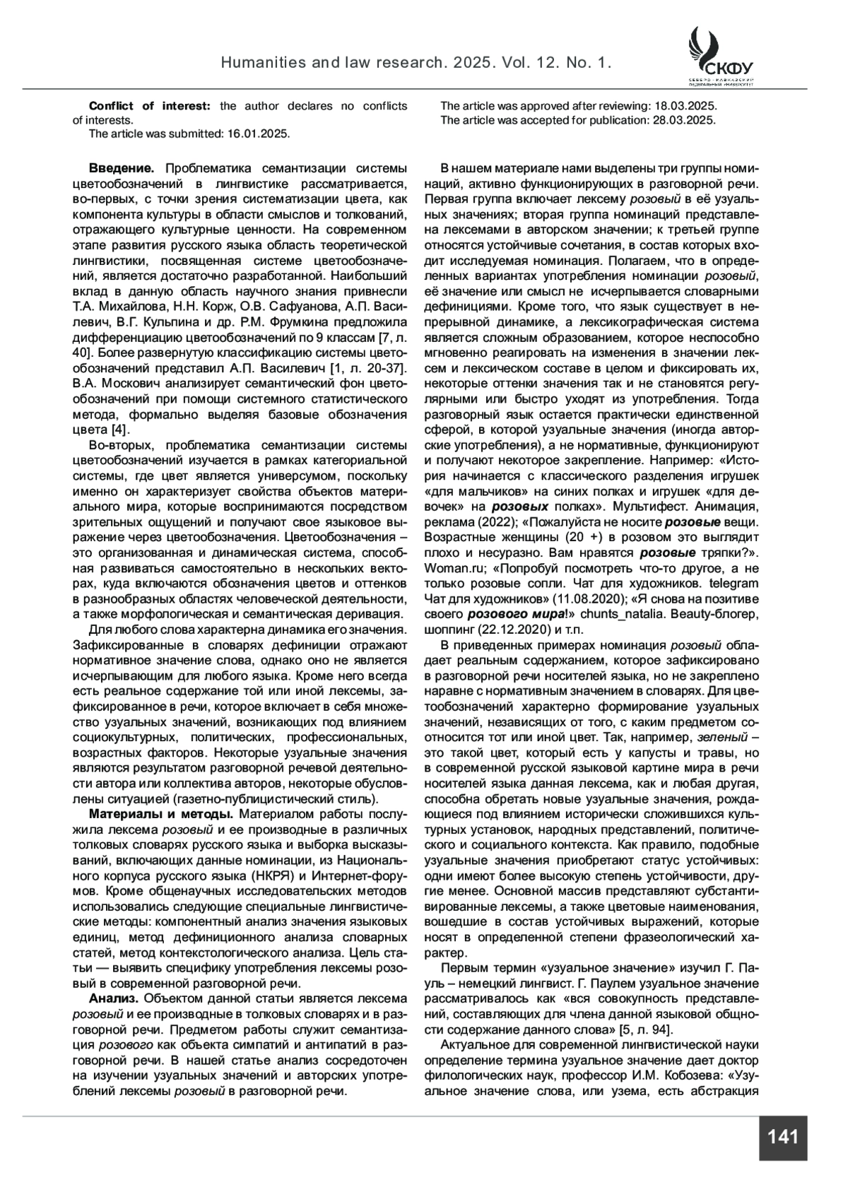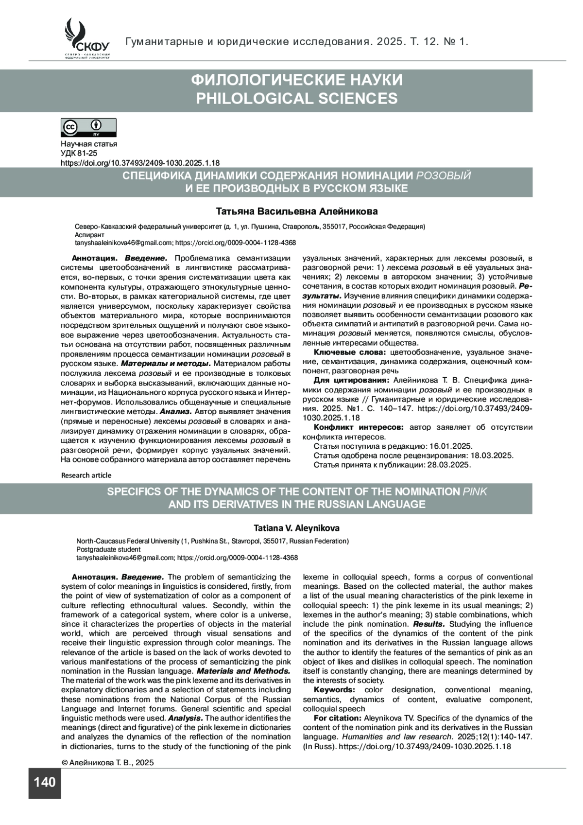 Введение. Проблематика семантизации системы цветообозначений в лингвистике рассматривается, во-первых, с точки зрения систематизации цвета как компонента культуры, отражающего этнокультурные ценности. Во-вторых, в рамках категориальной системы, где цвет является универсумом, поскольку характеризует свойства объектов материального мира, которые воспринимаются посредством зрительных ощущений и получают свое языковое выражение через цветообозначения. Актуальность статьи основана на отсутствии работ, посвященных различным проявлениям процесса семантизации номинации розовый в русском языке.