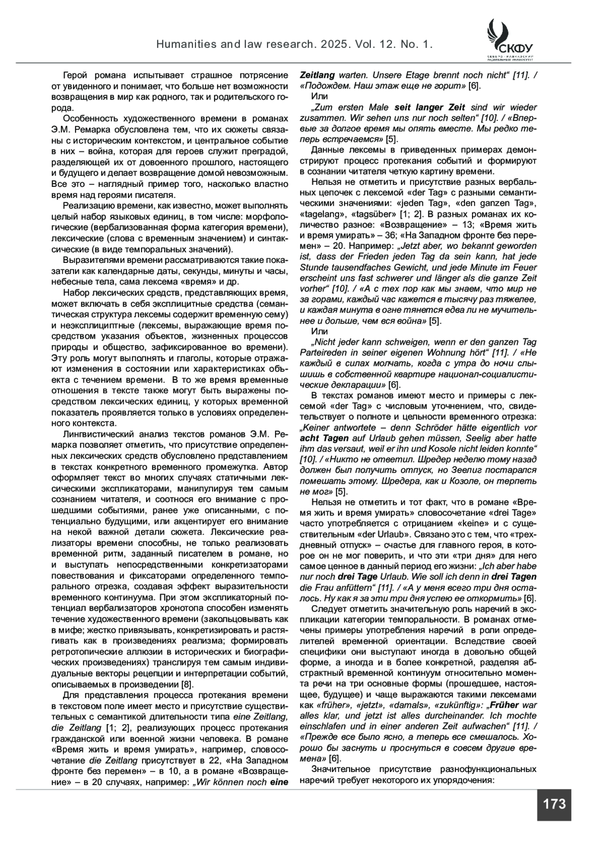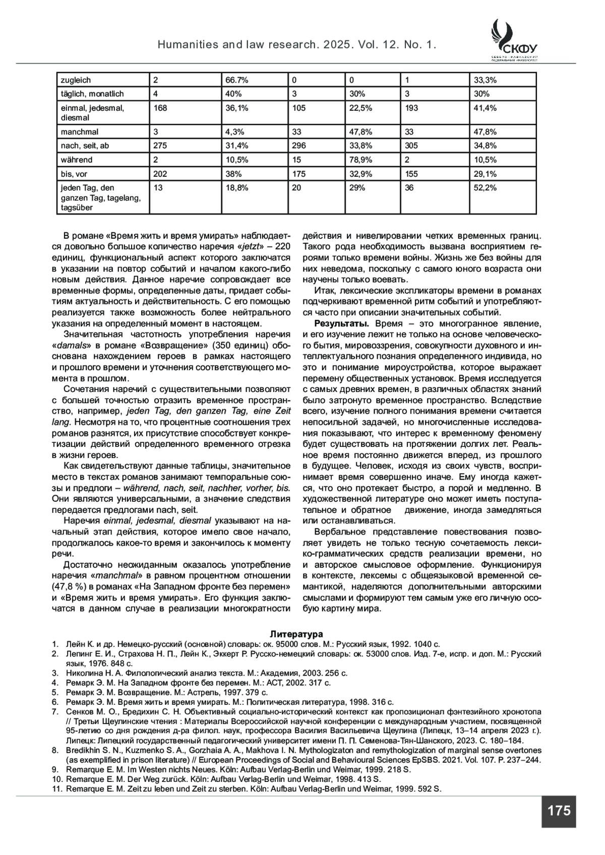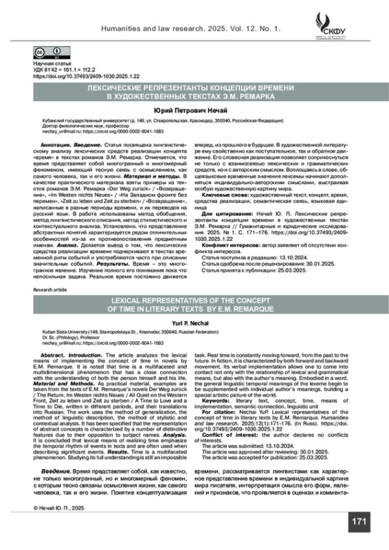 Введение. Статья посвящена лингвистическому анализу лексических средств реализации концепта «время» в текстах романов Э. М. Ремарка. Отмечается, что время представляет собой многогранный и многомерный феноменом, имеющий тесную связь с осмыслением, как самого человека, так и его жизни.