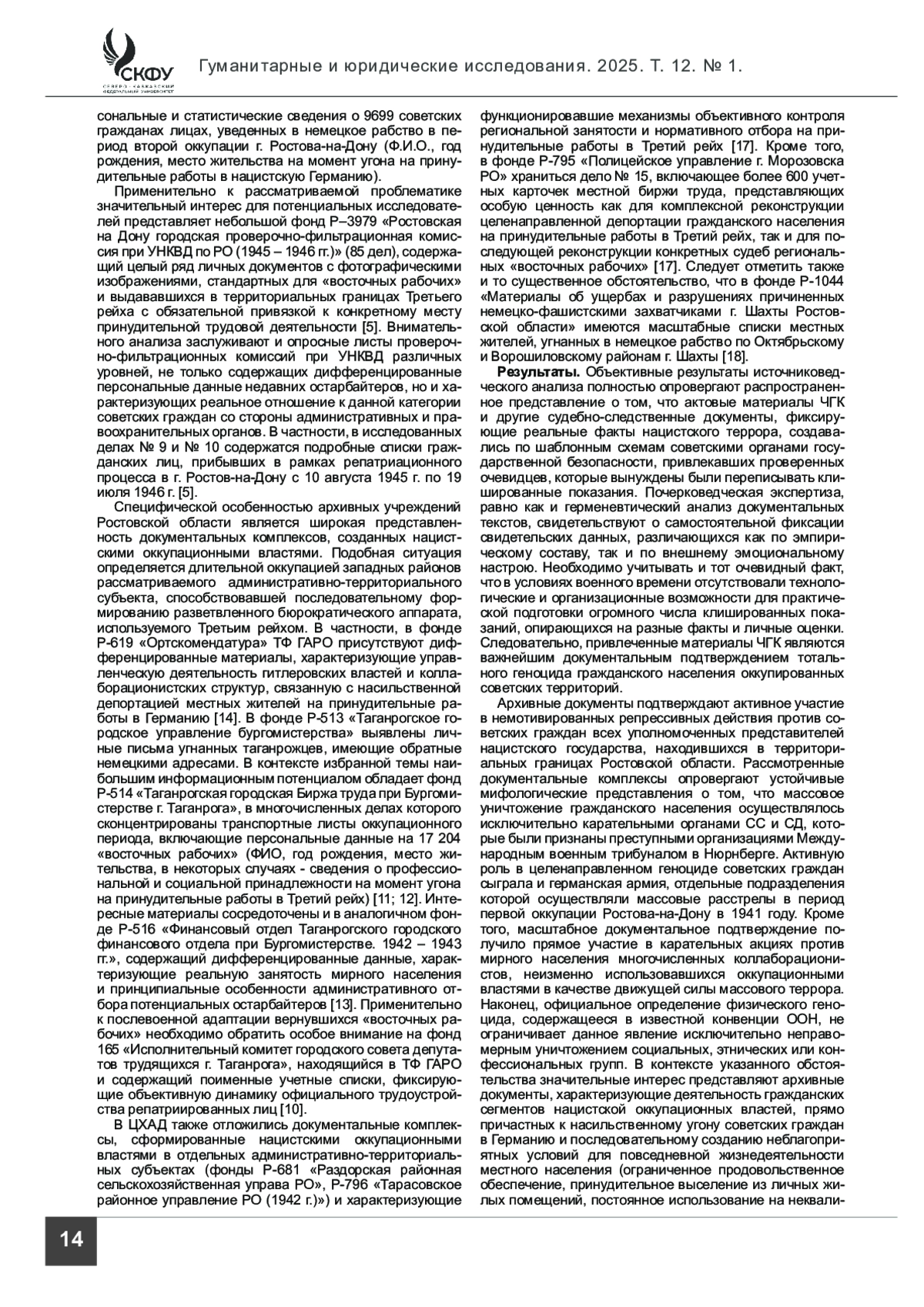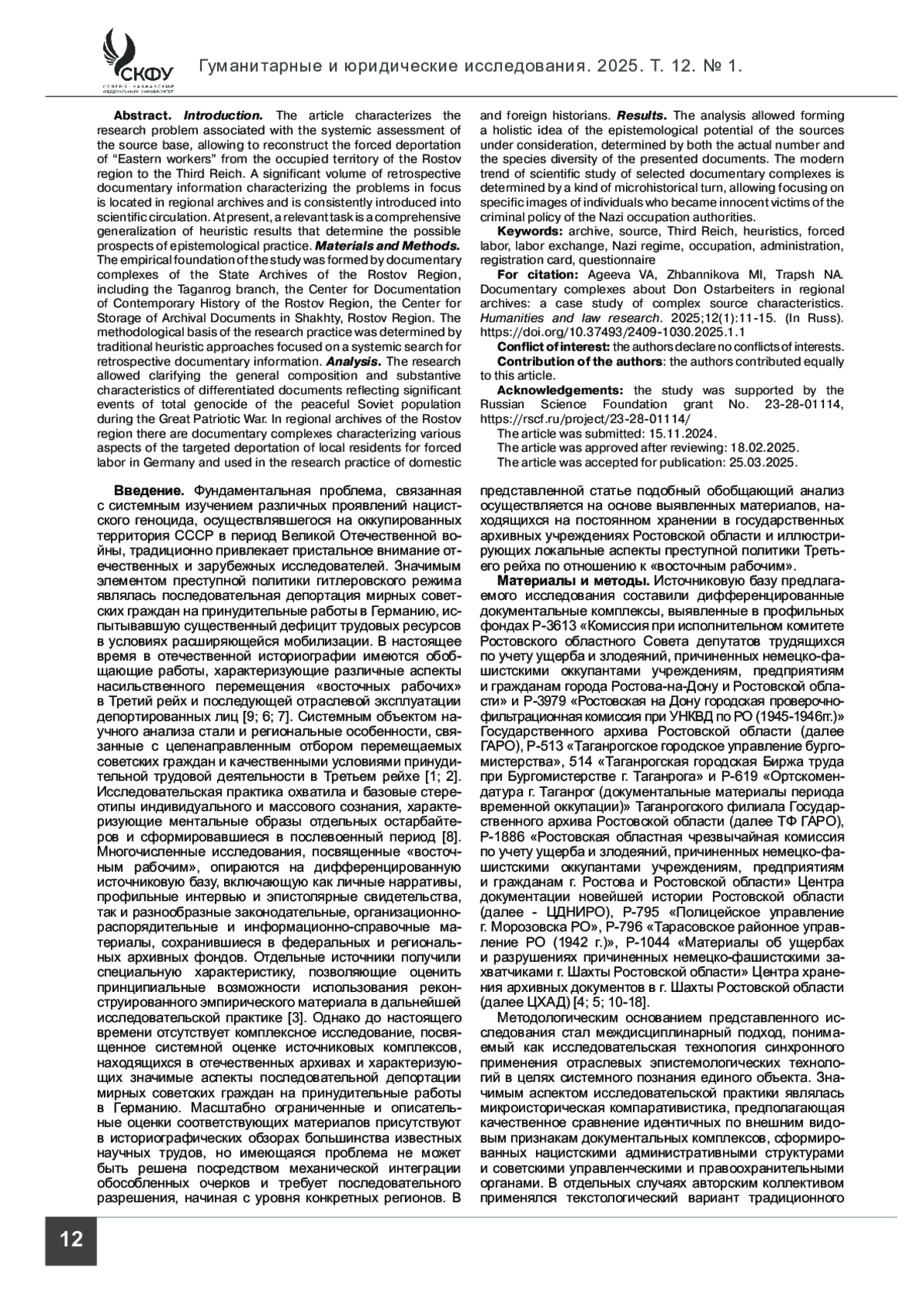Введение. Представленная статья характеризует исследовательскую проблему, связанную с системной оценкой источниковой базы, позволяющей реконструировать принудительную депортацию «восточных рабочих» с оккупированной территории Ростовской области в Третий рейх. Значительный объем ретроспективной документальной информации, характеризующий избранную проблематику, находится в региональных архивах и последовательно вводится в научный оборот. В настоящее время актуальной задачей является комплексное обобщение эвристических результатов, определяющих возможные перспективы эпистемологической практики.