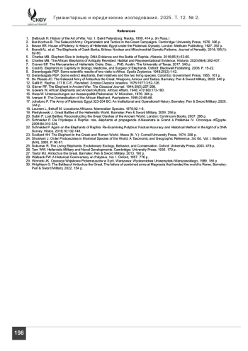 13. Glover R. F. The Elephant in Ancient War // The Classical Journal. 1944. Vol. 39. No. 5. P. 257-269.