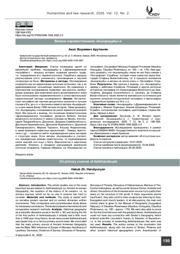 Введение. Статья посвящена одной из важнейших проблем «Ашхарацуйц»-а («Древнеармянской географии») – вопросу истории создания данного труда, т. е. определению его первоисточников. Подобного ракурса рассмотрения этого уникального произведения в научной литературе не было.