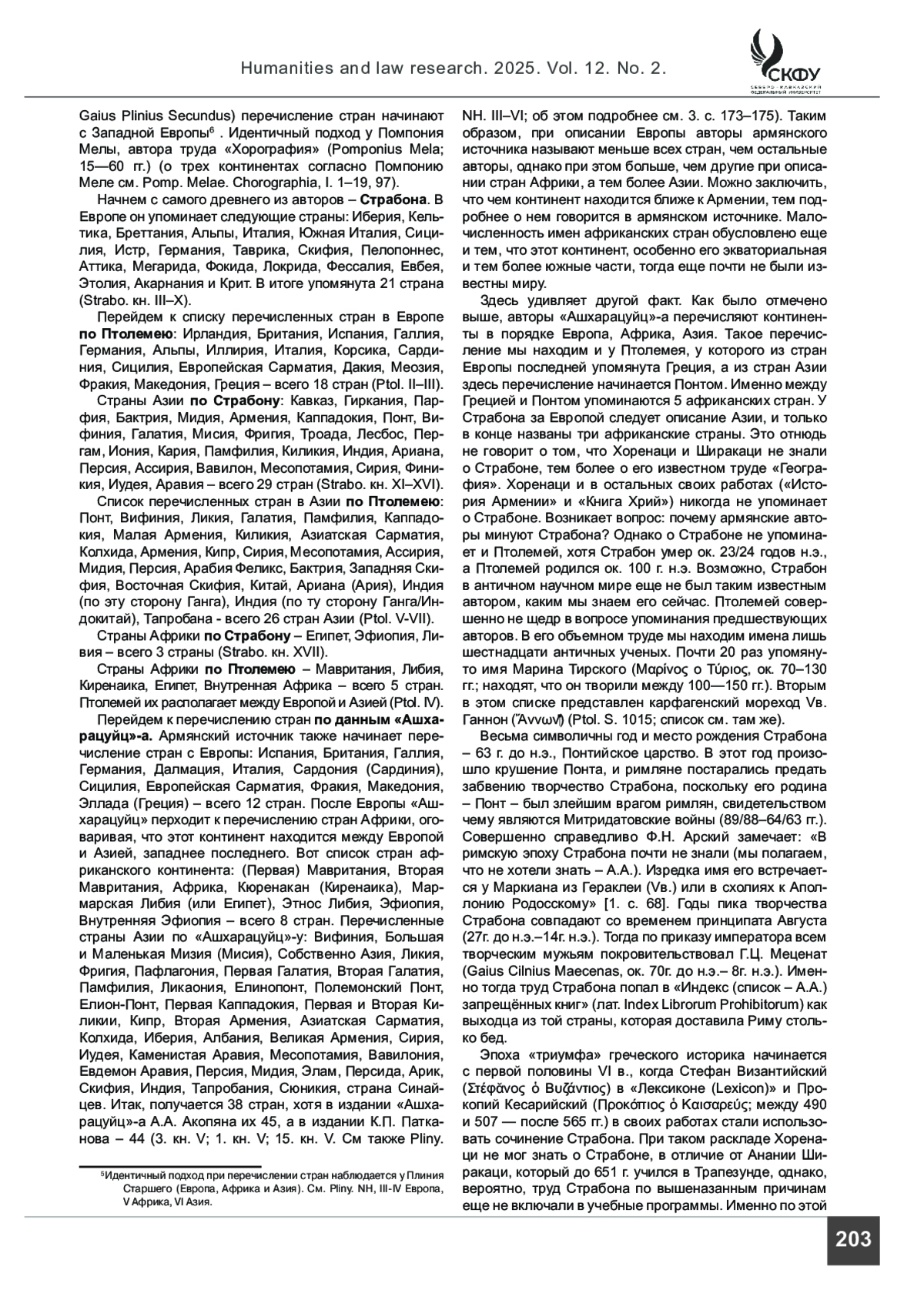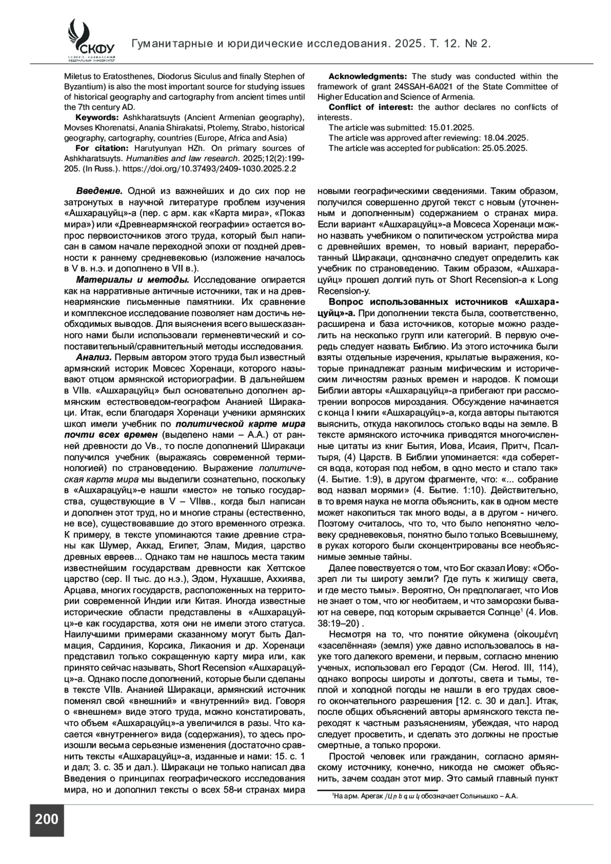 Результаты. Мы пришли к выводу, что «Ашхарацуйц» наряду с работами Страбона, Птолемея и других античных историков-географов (от Анаксимандра Милетского до Эратосфена, Диодора Сицилийского и, наконец, до Стефана Византийского) также является важнейшим источником для изучения вопросов исторической географии и картографии с древнейших времен до VII в. н. э.