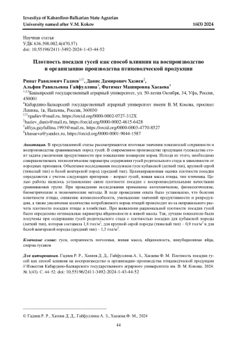 В представленной статье рассматриваются итоговые значения показателей сохранности и воспроизводства сравниваемых пород гусей. В современном производстве продукции гусеводства стоит задача увеличения продуктивности при повышении конверсии корма. Исходя из этого, необходимо совершенствовать технологические параметры содержания гусей родительского стада в зависимости от породных признаков. Объектами исследования послужили гуси кубанской (легкий тип), крупной серой (тяжелый тип) и белой венгерской пород (средний тип). Целенаправленная оценка плотности посадки определяется с учетом следующих критериев - возраст гусей, живая масса птицы, тип птичника. Целью работы являлось установление связи плотности посадки с воспроизводительными качествами сравниваемых групп. При проведении исследования применены зоотехнические, физиологические, биометрические и экономические методы. В ходе проведения опыта было установлено, что болезни конечности птицы, снижение жизнеспособности, уменьшение значений продуктивности и репродукции, а также увеличение количества потребляемого корма птицей происходит из-за неправильного расчета плотности посадки птицы в хозяйствах. При выявлении рациональной плотности посадки гусей были определены оптимальные параметры яйценоскости и живой массы. Так, лучшие показатели были получены при содержании гусей родительского стада с плотностью посадки для кубанской породы (легкий тип), которая составила 1,8 гол/м2, для крупной серой породы (тяжелый тип) - 0,9 гол/м2 и для белой венгерской породы (средний тип) - 1,3 гол/м2.