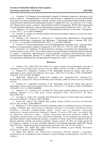 1. Андреева А. Е., Гадиев Р. Р. Уральские цеолиты - источник макро- и микроэлементов в рационе кур-несушек // Известия Оренбургского государственного аграрного университета. 2006. № 12(62). С. 20-22. EDN: QAUCBP