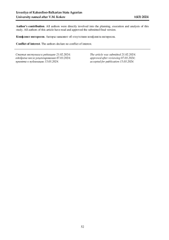 В статье рассматривается применение минеральных удобрений при выращивании кукурузы в условиях предгорной и степной зон Кабардино-Балкарии. Цель исследования - изучение влияния различных доз минеральных удобрений на продуктивность гибрида кукурузы. Полевые эксперименты проводились в 2021-2023 гг. Опытный участок в предгорной зоне (с. п. Чегем-2) характеризуется следующими агрохимическими показателями: содержимое гумуса в пахотном горизонте - 3,3%, общий азот - 0,28%, емкость поглощения - 34,4 мг∙эквивалент на 100 грамм почвы, реакция почвенного раствора нейтральная (рН - 7). Содержание подвижного фосфора составляет 15,0 мг на 100 г почвы, то есть средняя обеспеченность (по Чирикову), обеспеченность обменным калием повышенная - 15-18 мг на 100 г почвы (по Чирикову). По механическому составу эта почва тяжелосуглинистая. Содержание в ней физической глины составляет 57%. Также проводились полевые опыты в степной зоне (с. п. Верхний Курп). Почва опытного участка - обыкновенный (карбонатный) чернозем тяжелосуглинистого механического состава с содержанием: гумуса - 3,0-3,5; Р2О5 - 0,14-0,27 и К2О - 2,0-2,6% (по Мачигину). На основе полученных результатов, учитывая современные рыночные отношения, можно рекомендовать хозяйствам предгорной зоны республики при выращивании кукурузы на зерно в богарных условиях на типичных черноземах (при достаточном уровне обеспечения почвы азотом, подвижным фосфором и обменным калием) применять минеральные удобрения в дозе N60P60K60 или N90P60K60. Также оптимальными дозами минеральных удобрений при возделывании кукурузы на зерно в степной зоне следует считать N150Р60К90. При возделывании кукурузы на силос следует увеличивать дозу азота при одинаковом соотношении фосфора и калия. Самые высокие урожаи зеленой массы дали варианты N180P120K120 и N180P90K90.