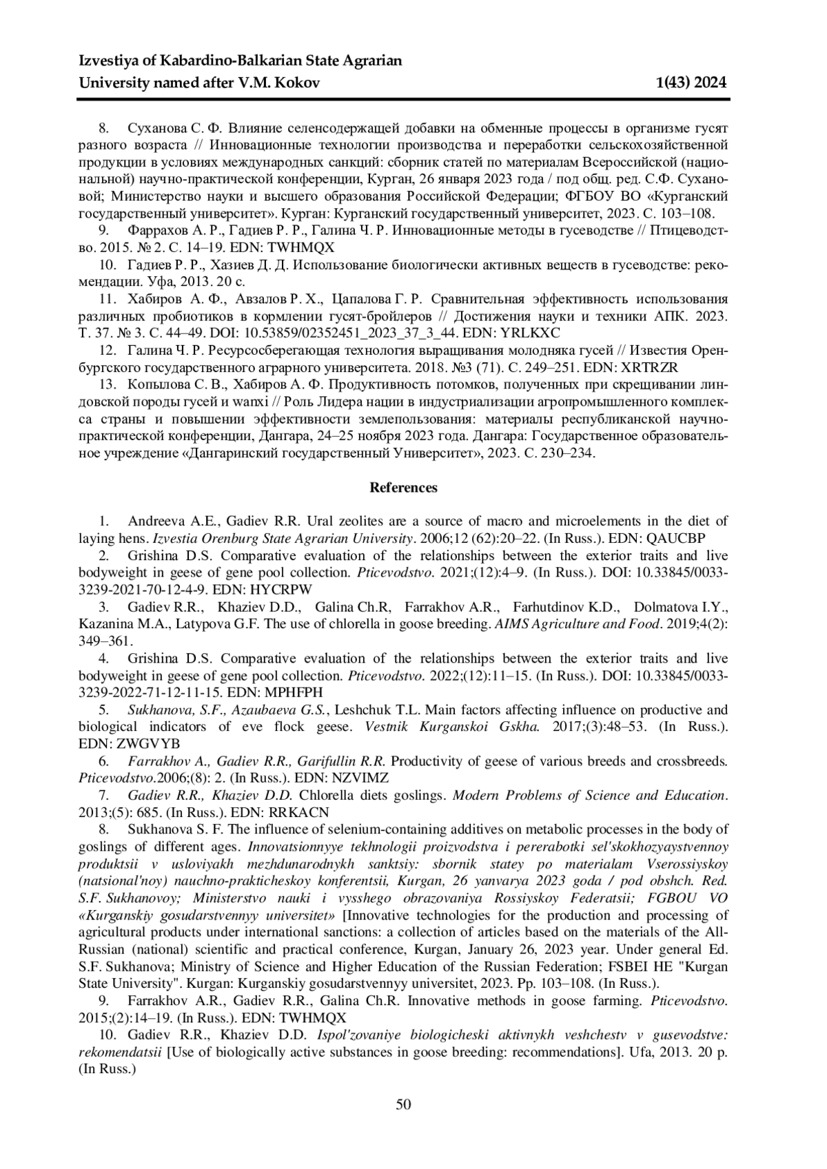 13. Копылова С. В., Хабиров А. Ф. Продуктивность потомков, полученных при скрещивании линдовской породы гусей и wanxi // Роль Лидера нации в индустриализации агропромышленного комплекса страны и повышении эффективности землепользования: материалы республиканской научно-практической конференции, Дангара, 24-25 ноября 2023 года. Дангара: Государственное образовательное учреждение “Дангаринский государственный Университет”, 2023. С. 230-234. EDN: SLXRDW