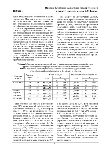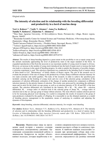 Результаты селекции овец в значительной мере зависят от возможности использовать ремонтный молодняк животных, максимально приближающихся по уровню признаков продуктивности к целевому стандарту стада. При расширенном воспроизводстве стада очевидна необходимость для ремонта использовать максимум поголовья молодняка. Однако увеличение численности поголовья, вводимого в стадо ремонтного молодняка для наращивания поголовья стада, приводит к снижению скорости селекционного прогресса. Чтобы предсказать динамику возможных изменений, прибегают к селекционному эксперименту. Его проводили в племенном стаде мериносовых овец сальсой породы в ООО «Белозѐрное» Сальского района Ростовской области. Цель исследований состояла в том, чтобы оценить перспективы скорости изменения продуктивности овец сальской породы при различной интенсивности отбора по двум основным хозяйственно-полезным качествам. В задачи исследований для достижения указанной цели входили: проведение бонитировки молодняка и овцематок селекционной группы, расчет параметров селекционного дифференциала, оценка изменения другой компоненты продуктивности при различной интенсивности отбора по приоритетному признаку отбора. Результаты учета обрабатывали путем вычисления средней арифметической величины и еѐ ошибки по всей половозрастной группе, а также при интенсивности отбора 20, 40 и 80% лучших животных. Селекционный дифференциал вычисляли по формуле: SD = M1 - M2, где SD - селекционный дифференциал; M1 - средний показатель селекционного признака в отобранной группе овец; M2 - средний показатель селекционного признака в половозрастной группе овец без отбора. Наиболее эффективной тандемная селекция оказалась для повышения физического настрига шерсти. Результаты исследований полезно экстраполировать на группу баранов-производителей, оцениваемых по качеству потомства. Полученные материалы целесообразно использовать как модель управления селекционным процессом в популяции, средство анализа еѐ состояния и корректировки динамики развития.