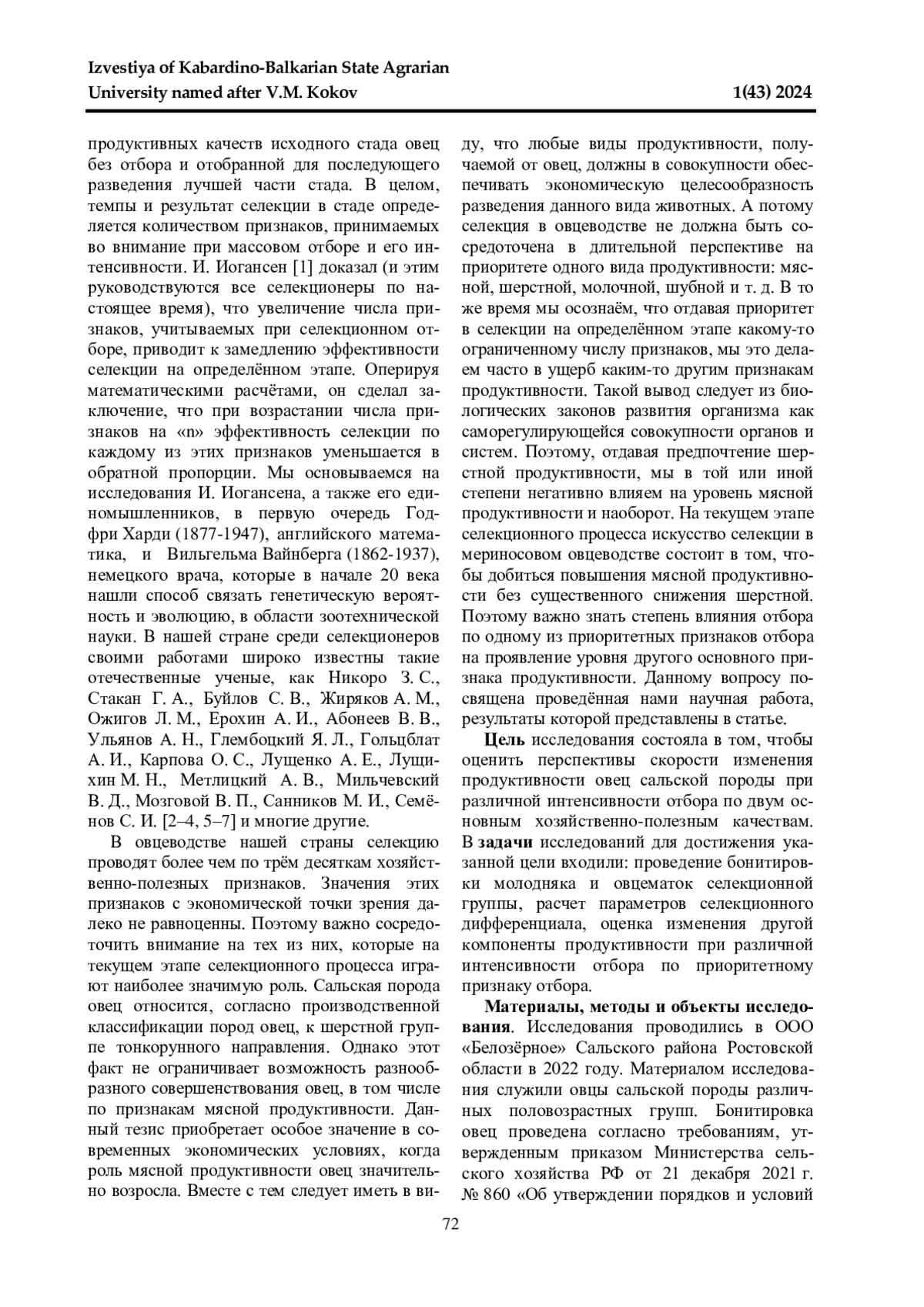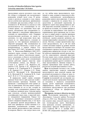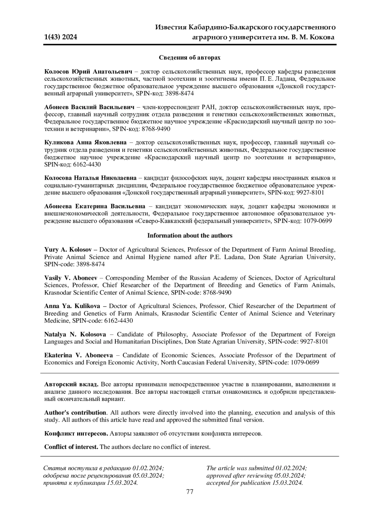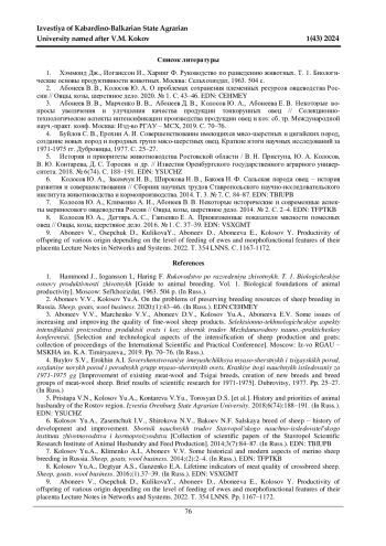 3. Абонеев В. В., Марченко В. В., Абонеев Д. В., Колосов Ю. А., Абонеева Е. В. Некоторые вопросы увеличения и улучшения качества продукции тонкорунных овец // Селекционнотехнологические аспекты интенсификации производства продукции овец и коз: сб. тр. Международной науч.-практ. конф. Москва: Изд-во РГАУ - МСХ, 2019. С. 70-76.