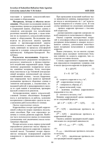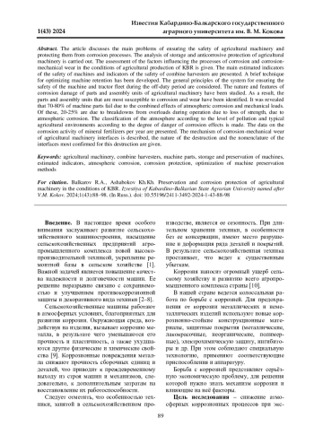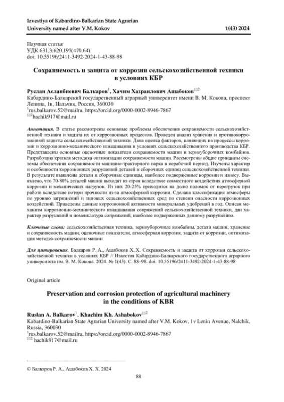 В статье рассмотрены основные проблемы обеспечения сохраняемости сельскохозяйственной техники и защита их от коррозионных процессов. Проведен анализ хранения и противокоррозионной защиты сельскохозяйственной техники. Дана оценка факторов, влияющих на процессы коррозии и коррозионно-механического изнашивания в условиях сельскохозяйственного производства КБР. Представлены основные оценочные показатели сохраняемости машин и зерноуборочных комбайнов. Разработана краткая методика оптимизации сохраняемости машин. Рассмотрены общие принципы системы обеспечения сохраняемости машинно-тракторного парка в нерабочий период. Изучены характер и особенности коррозионных разрушений деталей и сборочных единиц сельскохозяйственной техники. В результате выявлены детали и сборочные единицы, наиболее подверженные коррозии и износу. Выявлено, что 70-80% деталей машин выходят из строя вследствие совместного воздействия атмосферной коррозии и механических нагрузок. Из них 20-25% приходится на долю поломок от перегрузок при работе вследствие потери прочности из-за атмосферной коррозии. Сделана классификация атмосферы по уровню загрязнений и типовых сельскохозяйственных сред по степени опасности коррозионных воздействий. Приведены данные коррозионной активности минеральных удобрений в год. Описан механизм коррозионно-механического изнашивания сопряжений сельскохозяйственной техники, дан характер разрушений и номенклатура сопряжений, наиболее подверженных данному разрушению.