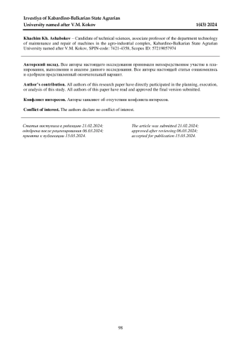 2. Апажев А. К., Шекихачев Ю. А., Хажметов Л. М., Егожев А. М., Фиапшев А. Г., Барагунов А. Б. Повышение эксплуатационной надежности сельскохозяйственных машин // Техника и оборудование для села. 2023. № 4(310). С. 12-16. DOI: 10.33267/2072-9642-2023-4-12-16 EDN: HHJDDY