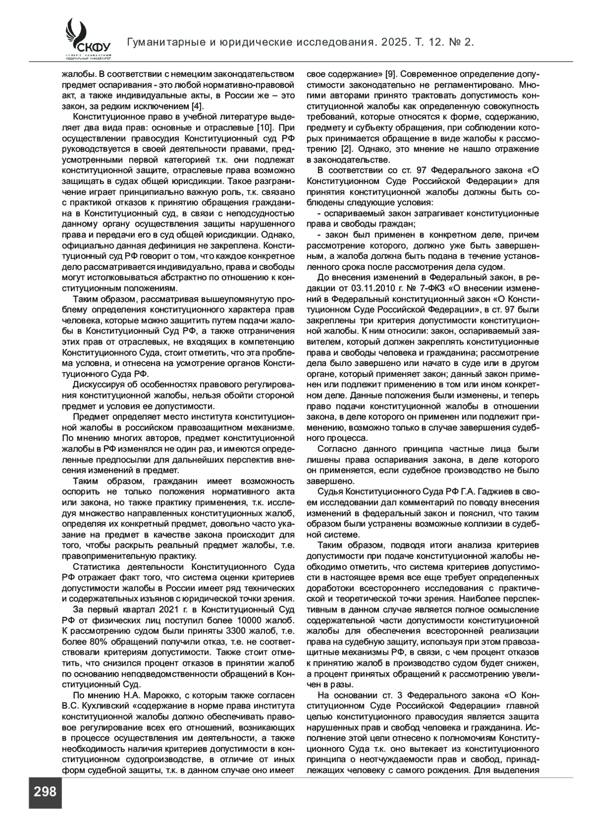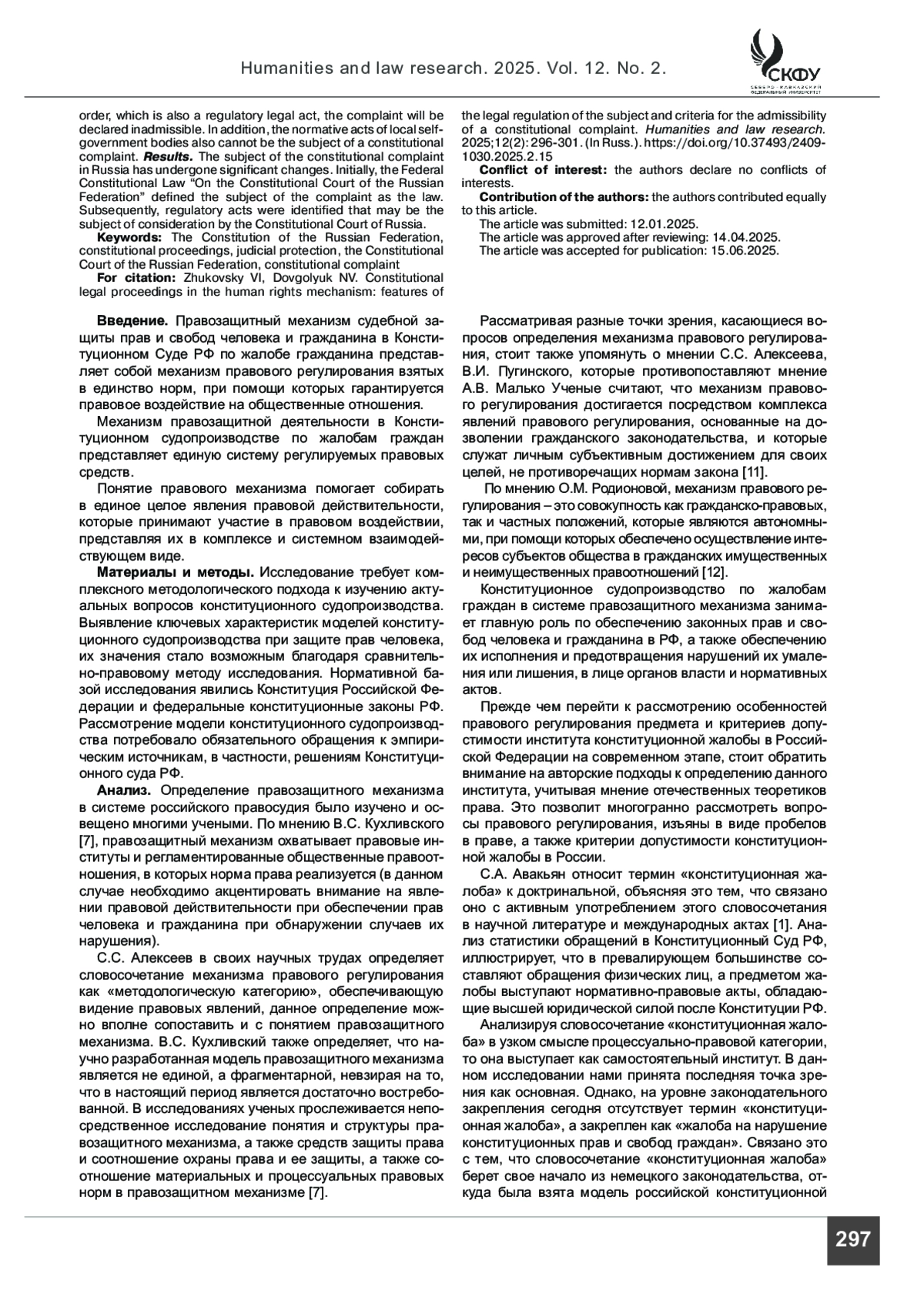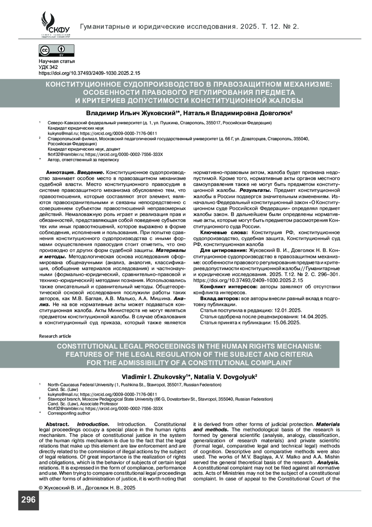 ЖУКОВСКИЙ В. И., ДОВГОЛЮК Н. В. КОНСТИТУЦИОННОЕ СУДОПРОИЗВОДСТВО В ПРАВОЗАЩИТНОМ МЕХАНИЗМЕ: ОСОБЕННОСТИ ПРАВОВОГО РЕГУЛИРОВАНИЯ ПРЕДМЕТА И КРИТЕРИЕВ ДОПУСТИМОСТИ КОНСТИТУЦИОННОЙ ЖАЛОБЫ // ГУМАНИТАРНЫЕ И ЮРИДИЧЕСКИЕ ИССЛЕДОВАНИЯ. 2025. ТОМ 12, № 2