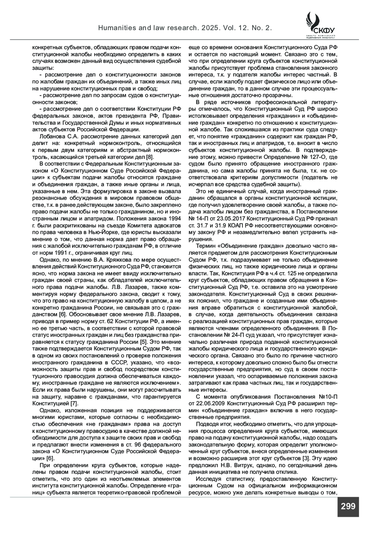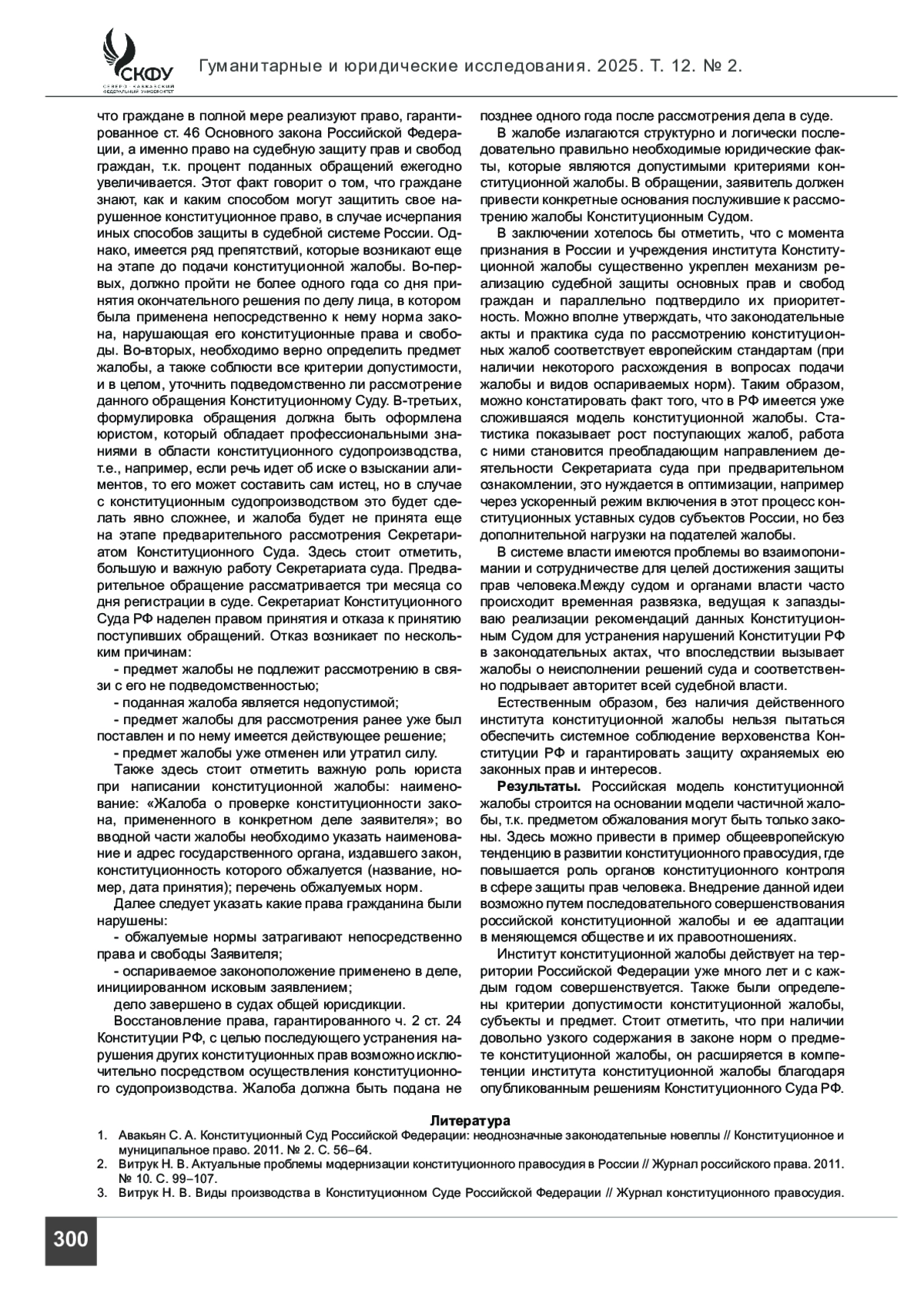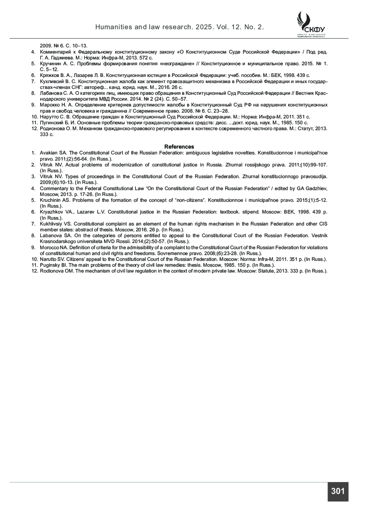 ЖУКОВСКИЙ В. И., ДОВГОЛЮК Н. В. КОНСТИТУЦИОННОЕ СУДОПРОИЗВОДСТВО В ПРАВОЗАЩИТНОМ МЕХАНИЗМЕ: ОСОБЕННОСТИ ПРАВОВОГО РЕГУЛИРОВАНИЯ ПРЕДМЕТА И КРИТЕРИЕВ ДОПУСТИМОСТИ КОНСТИТУЦИОННОЙ ЖАЛОБЫ // ГУМАНИТАРНЫЕ И ЮРИДИЧЕСКИЕ ИССЛЕДОВАНИЯ. 2025. ТОМ 12, № 2