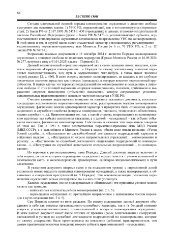 С 1 января 2025 г. вступил в действие принятый Минюстом России новый Порядок конвоирования осужденных к лишению свободы по плановым маршрутам, который во многом урегулировал и конкретизировал на подзаконном (ведомственном) уровне процесс конвоирования осужденных к лишению свободы. Особую конкретику получили права, обязанности осужденных и запреты, распространяющиеся на них. Новый Порядок не имеет грифа ограниченного пользования. Формально он открыт для применения и обсуждения специалистов, практиков, ученых и общественности, что является основанием для дальнейших научных исследований и расширения системы знаний о процедуре перемещения осужденных к лишению свободы.