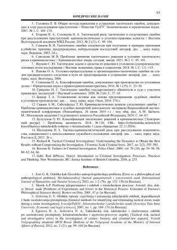3. Головина Е. В. Общие методы выявления и устранения тактических ошибок, допущенных в ходе расследования преступления // Известия ТулГУ. Экономические и юридические науки. 2007. № 1. С. 169-174.