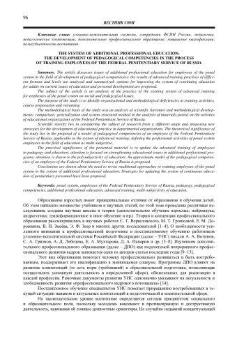 Сделаны выводы о необходимости пересмотра традиционных подходов к обучению сотрудников УИС в системе дополнительного профессионального образования; предложены стратегии обновления системы непрерывного образования кадров УИС.