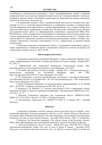 1. Генеральная прокуратура Российской Федерации. Главное управление правовой статистики и информационных технологий. Состояние преступности в России за январь - декабрь 2020 г. М., 2020. 7 с.