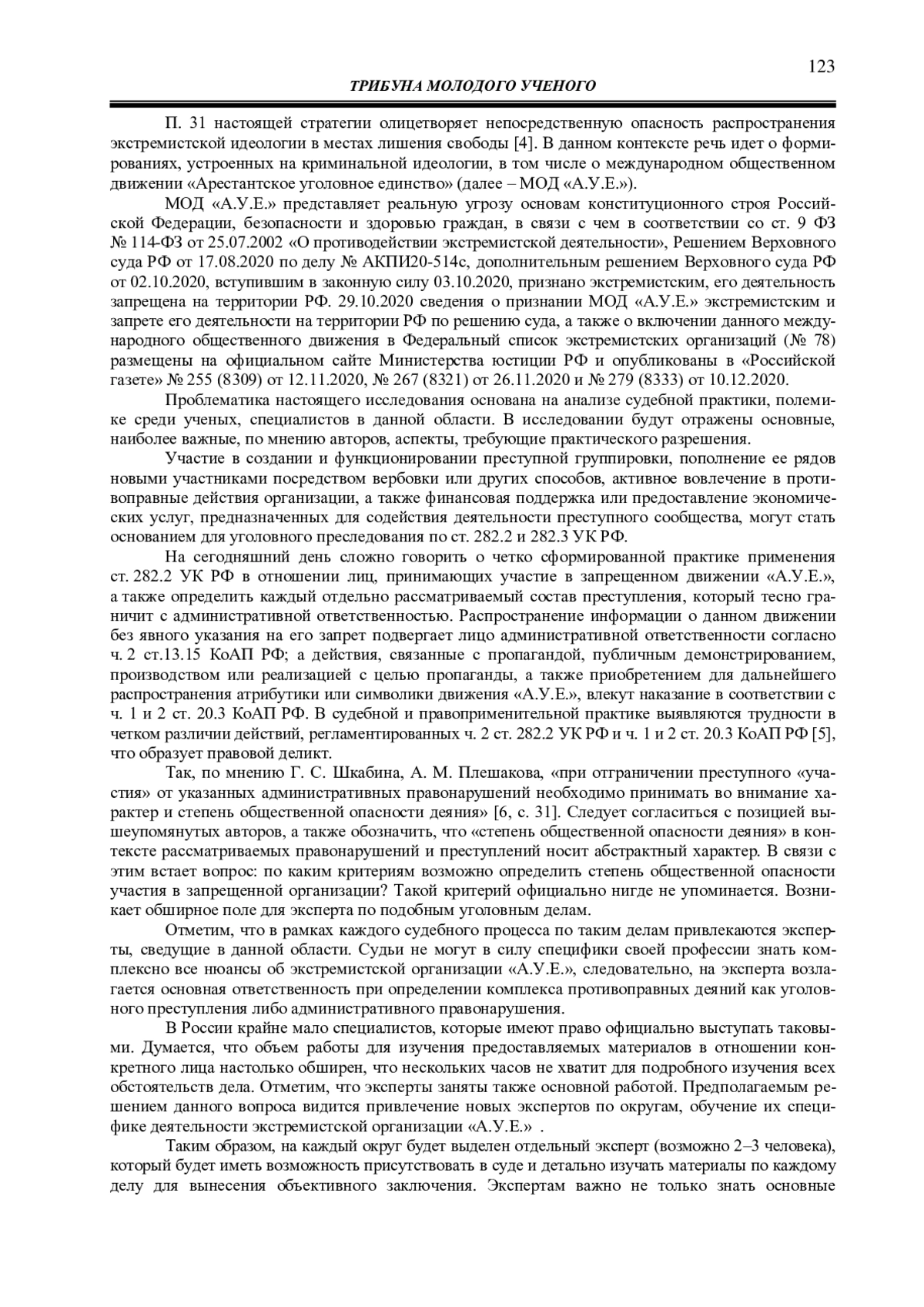 6. Плешаков А. М., Шкабин Г. С. Участие в деятельности “АУЕ” в учреждениях, обеспечивающих изоляцию от общества: проблемы квалификации // Научный портал МВД России. 2023. № 2 (62). С. 31-37. EDN: CEACUO