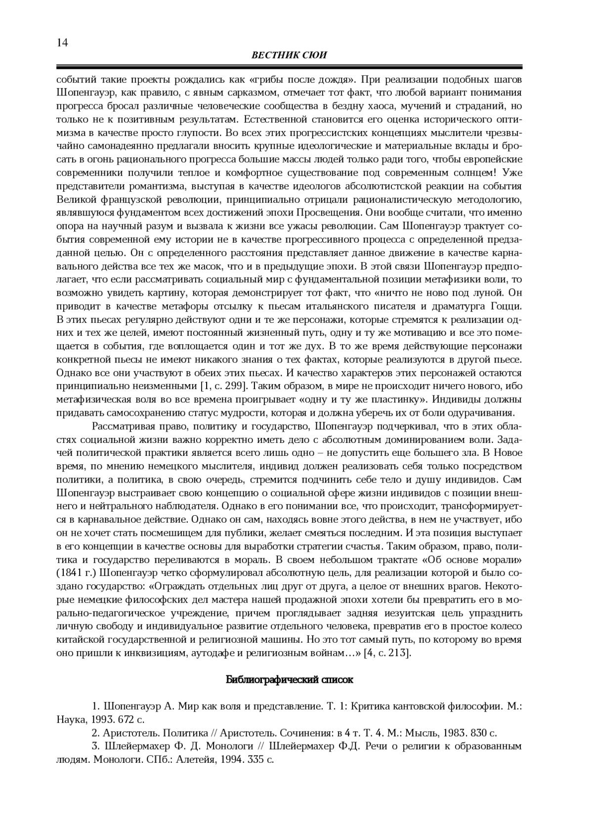 В статье рассматриваются идеи великого немецкого мыслителя А. Шопенгауэра, связанные с его взглядами на проблематику права, морали и государства, изложенные в его знаменитом философском трактате «Мир как воля и представление». В статье раскрывается, что причиной перехода философов в пространство иррационализма явился тот факт, что рационалистическая методология не позволила высветить смыслы всей философской системы до конца, ибо всегда оставался недоступный разуму уголок. Именно этот остаток и привел к поиску чего-то сверх- или нерационального, которое бы позволило эксплицировать эти предельные смыслы мира. Такое начало в виде воли Шопенгауэр и кладет в основание своих представлений о социокультурном мире. Сама возможность права коренится в необходимости противостояния в отношении эгоизма и откровенного произвола человеческих индивидов. Целью же формирования государственного механизма выступает объединение воль индивидов в борьбе за выживание в опасном мире. Автор подчеркивает, что роль государства и права сводится всего лишь к функции «необходимого зла». Именно в праве, государстве и морали Шопенгауэр видит абсолютную доминанту мирового начала - воли, ибо их задача состоит в недопущении еще большего зла в социальном мире.