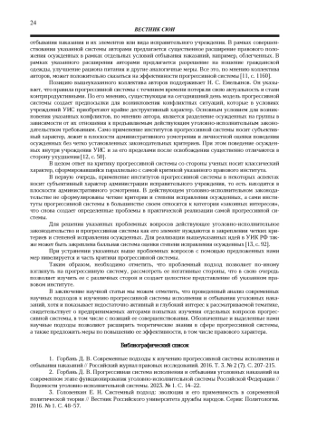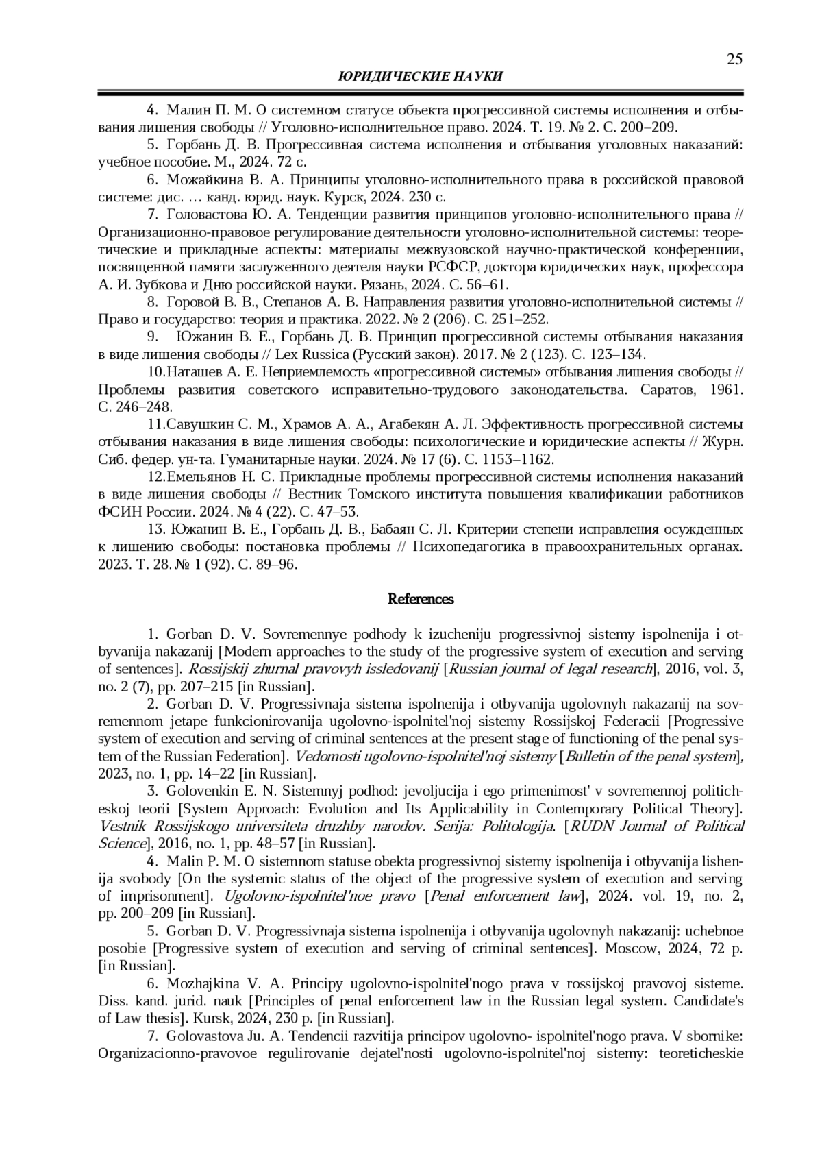 2. Горбань Д. В. Прогрессивная система исполнения и отбывания уголовных наказаний на современном этапе функционирования уголовно-исполнительной системы Российской Федерации // Ведомости уголовно-исполнительной системы. 2023. № 1. С. 14-22. EDN: DJASQL