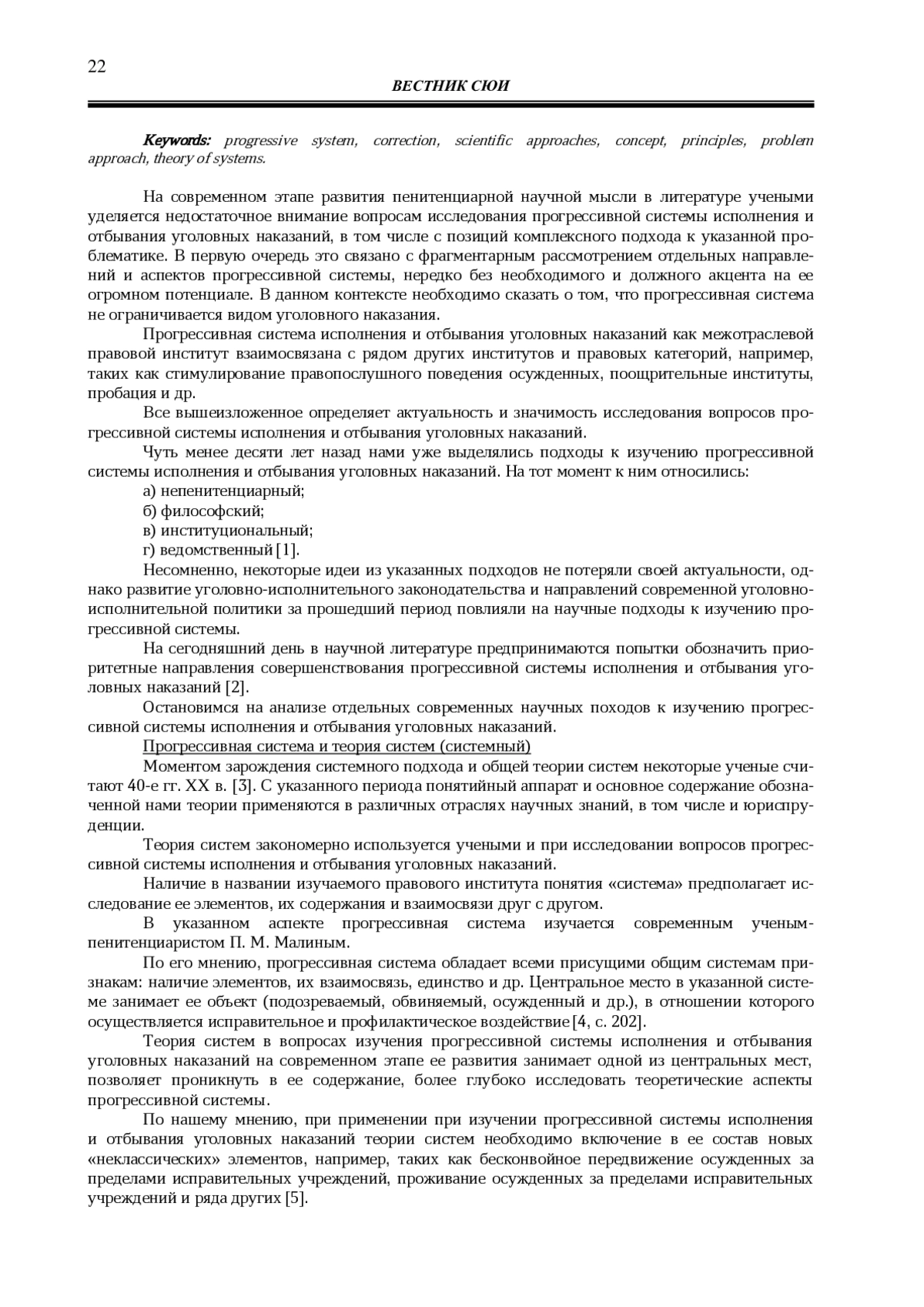На современном этапе развития пенитенциарной научной мысли в литературе учеными уделяется недостаточное внимание вопросам исследования прогрессивной системы исполнения и отбывания уголовных наказаний, в том числе с позиций комплексного подхода к указанной проблематике. В первую очередь это связано с фрагментарным рассмотрением отдельных направлений и аспектов прогрессивной системы, нередко без необходимого и должного акцента на ее огромном потенциале. В данном контексте необходимо сказать о том, что прогрессивная система не ограничивается видом уголовного наказания.