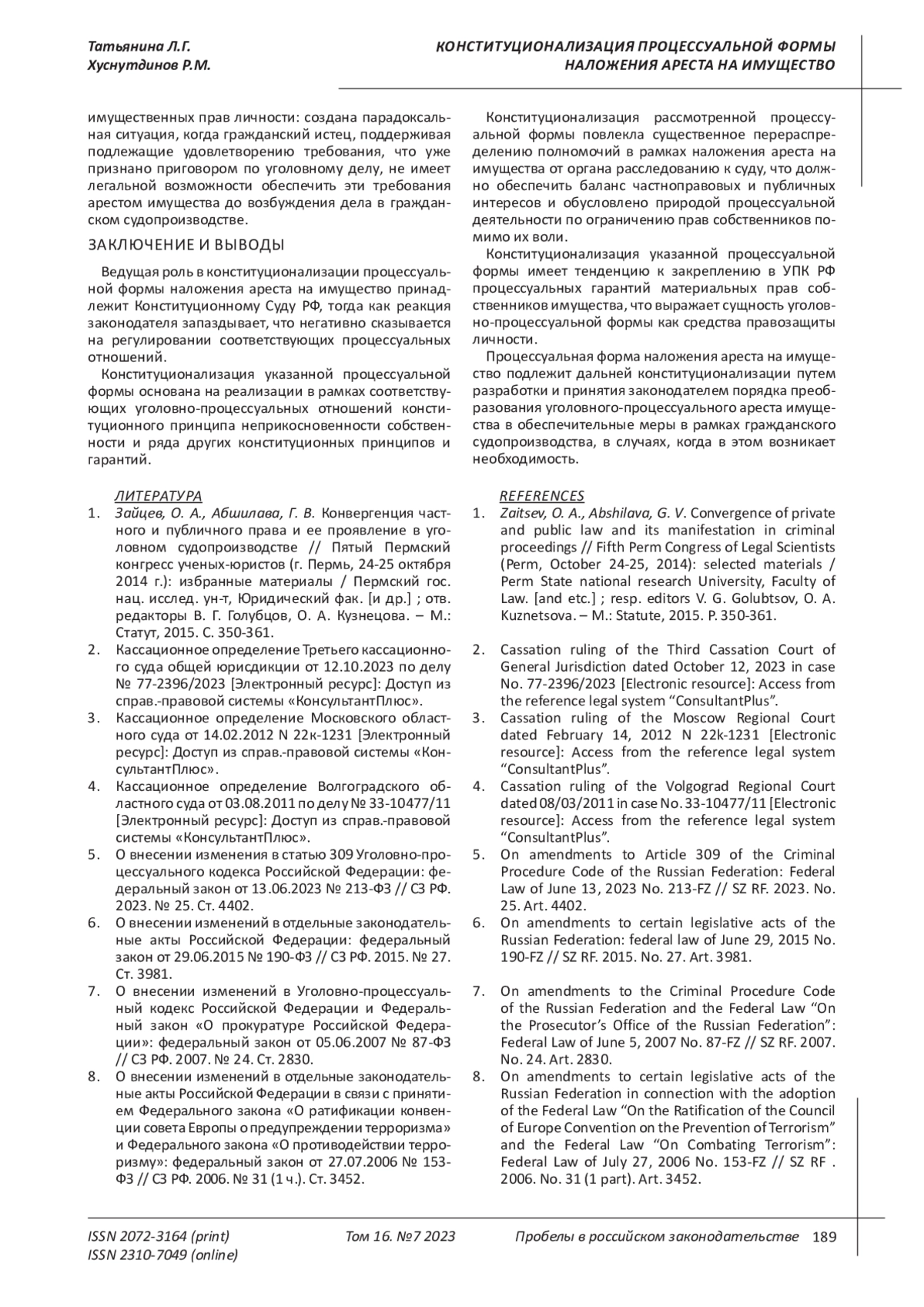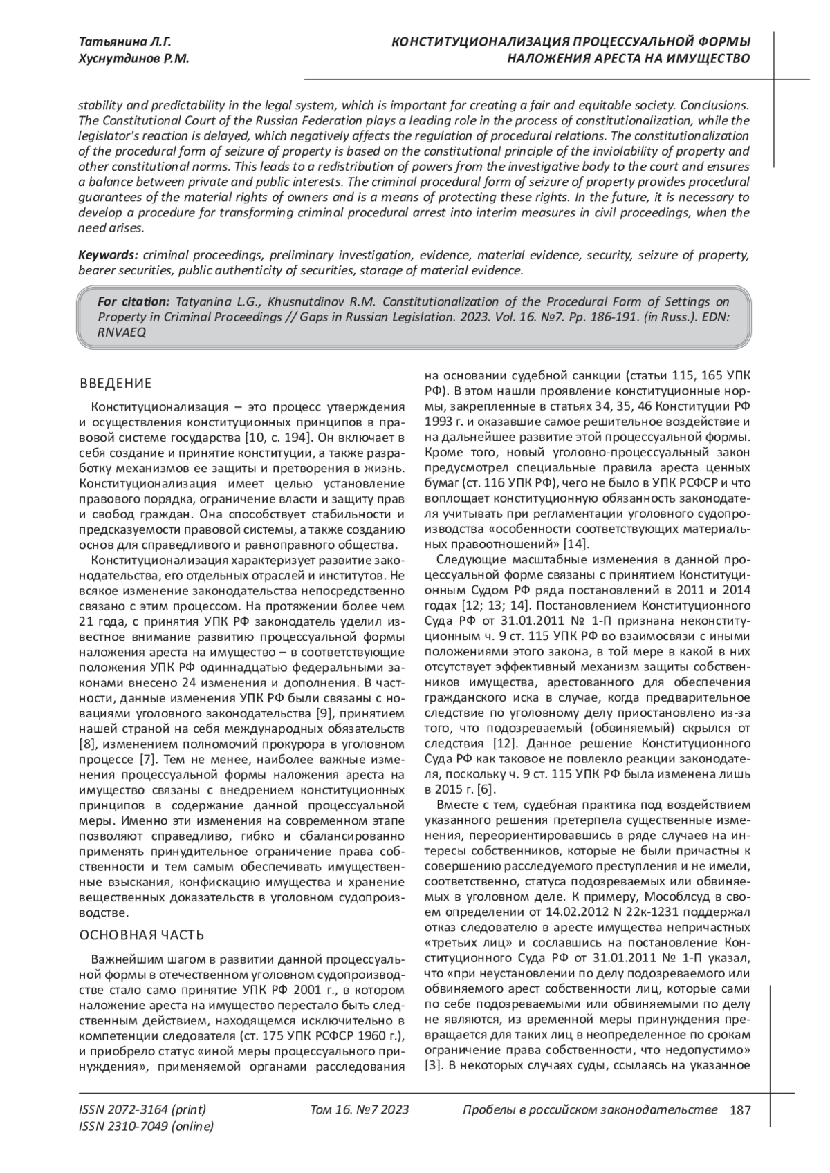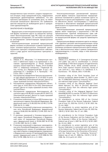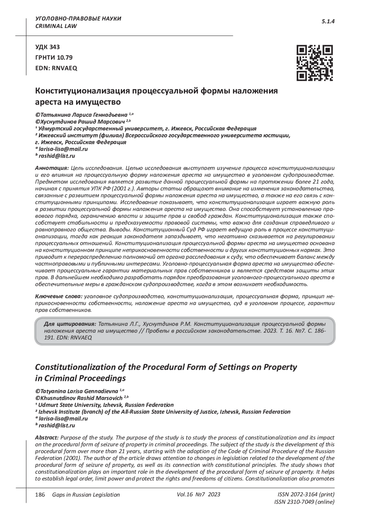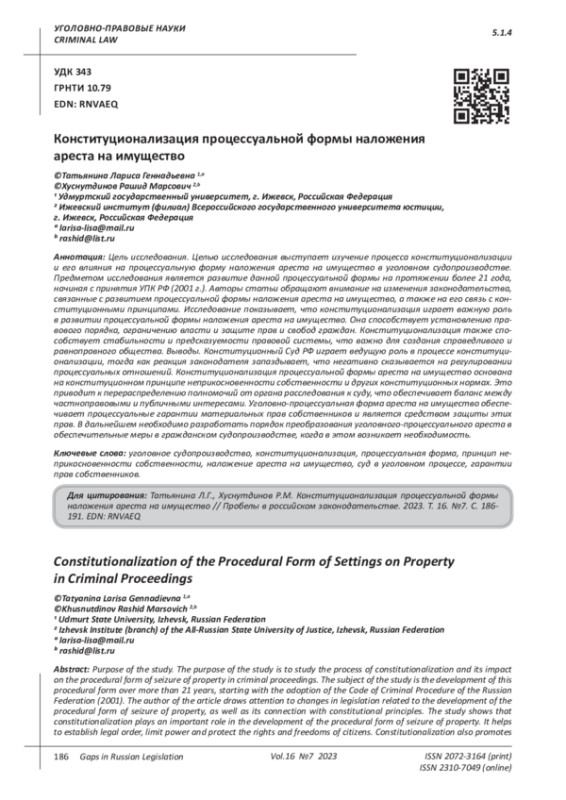 Цель исследования. Целью исследования выступает изучение процесса конституционализации и его влияния на процессуальную форму наложения ареста на имущество в уголовном судопроизводстве. Предметом исследования является развитие данной процессуальной формы на протяжении более 21 года, начиная с принятия УПК РФ (2001 г.). Авторы статьи обращают внимание на изменения законодательства, связанные с развитием процессуальной формы наложения ареста на имущество, а также на его связь с конституционными принципами. Исследование показывает, что конституционализация играет важную роль в развитии процессуальной формы наложения ареста на имущество. Она способствует установлению правового порядка, ограничению власти и защите прав и свобод граждан. Конституционализация также способствует стабильности и предсказуемости правовой системы, что важно для создания справедливого и равноправного общества. Выводы. Конституционный Суд РФ играет ведущую роль в процессе конституционализации, тогда как реакция законодателя запаздывает, что негативно сказывается на регулировании процессуальных отношений. Конституционализация процессуальной формы ареста на имущество основана на конституционном принципе неприкосновенности собственности и других конституционных нормах. Это приводит к перераспределению полномочий от органа расследования к суду, что обеспечивает баланс между частноправовыми и публичными интересами. Уголовно-процессуальная форма ареста на имущество обеспечивает процессуальные гарантии материальных прав собственников и является средством защиты этих прав. В дальнейшем необходимо разработать порядок преобразования уголовного-процессуального ареста в обеспечительные меры в гражданском судопроизводстве, когда в этом возникает необходимость.