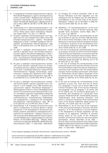 14. По делу о проверке конституционности положений частей первой, третьей и девятой статьи 115, пункта 2 части первой статьи 208 Уголовно-процессуального кодекса Российской Федерации и абзаца девятого пункта 1 статьи 126 Федерального закона “О несостоятельности (банкротстве)” в связи с жалобами закрытого акционерного общества “Недвижимость-М”, общества с ограниченной ответственностью “Соломатинское хлебоприемное предприятие” и гражданки Л.И. Костаревой: постановление Конституционного Суда РФ от 31.01.2011 № 1-П // СЗ РФ. 2011. № 6. Ст. 897.