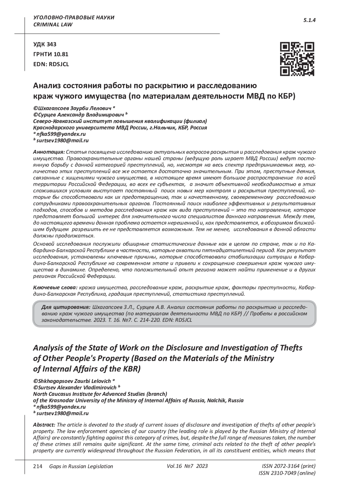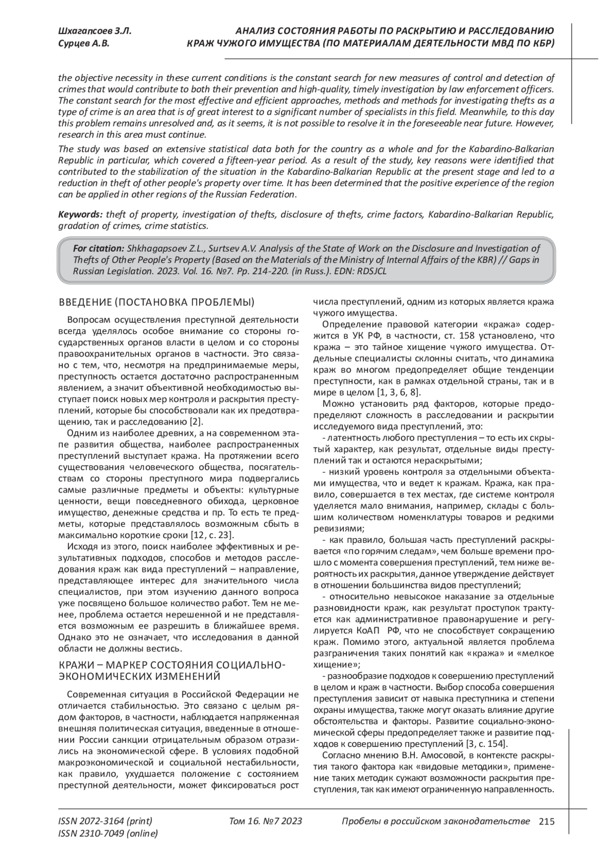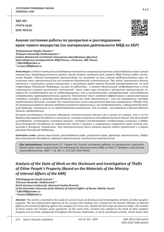 Статья посвящена исследованию актуальных вопросов раскрытия и расследования краж чужого имущества. Правоохранительные органы нашей страны (ведущую роль играет МВД России) ведут постоянную борьбу с данной категорией преступлений, но, несмотря на весь спектр предпринимаемых мер, количество этих преступлений все же остается достаточно значительным. При этом, преступные деяния, связанные с хищениями чужого имущества, в настоящее время имеют большое распространение по всей территории Российской Федерации, во всех ее субъектах, а значит объективной необходимостью в этих сложившихся условиях выступает постоянный поиск новых мер контроля и раскрытия преступлений, которые бы способствовали как их предотвращению, так и качественному, своевременному расследованию сотрудниками правоохранительных органов. Постоянный поиск наиболее эффективных и результативных подходов, способов и методов расследования краж как вида преступлений - это то направление, которое представляет большой интерес для значительного числа специалистов данного направления. Между тем, до настоящего времени данная проблема остается нерешенной и, как представляется, в обозримом ближайшем будущем разрешить ее не представляется возможным. Тем не менее, исследования в данной области должны продолжаться. Основой исследования послужили обширные статистические данные как в целом по стране, так и по Кабардино-Балкарской Республике в частности, которые охватили пятнадцатилетний период. Как результат исследования, установлены ключевые причины, которые способствовали стабилизации ситуации в Кабардино-Балкарской Республике на современном этапе и привели к сокращению совершения краж чужого имущества в динамике. Определено, что положительный опыт региона может найти применение и в других регионах Российской Федерации.