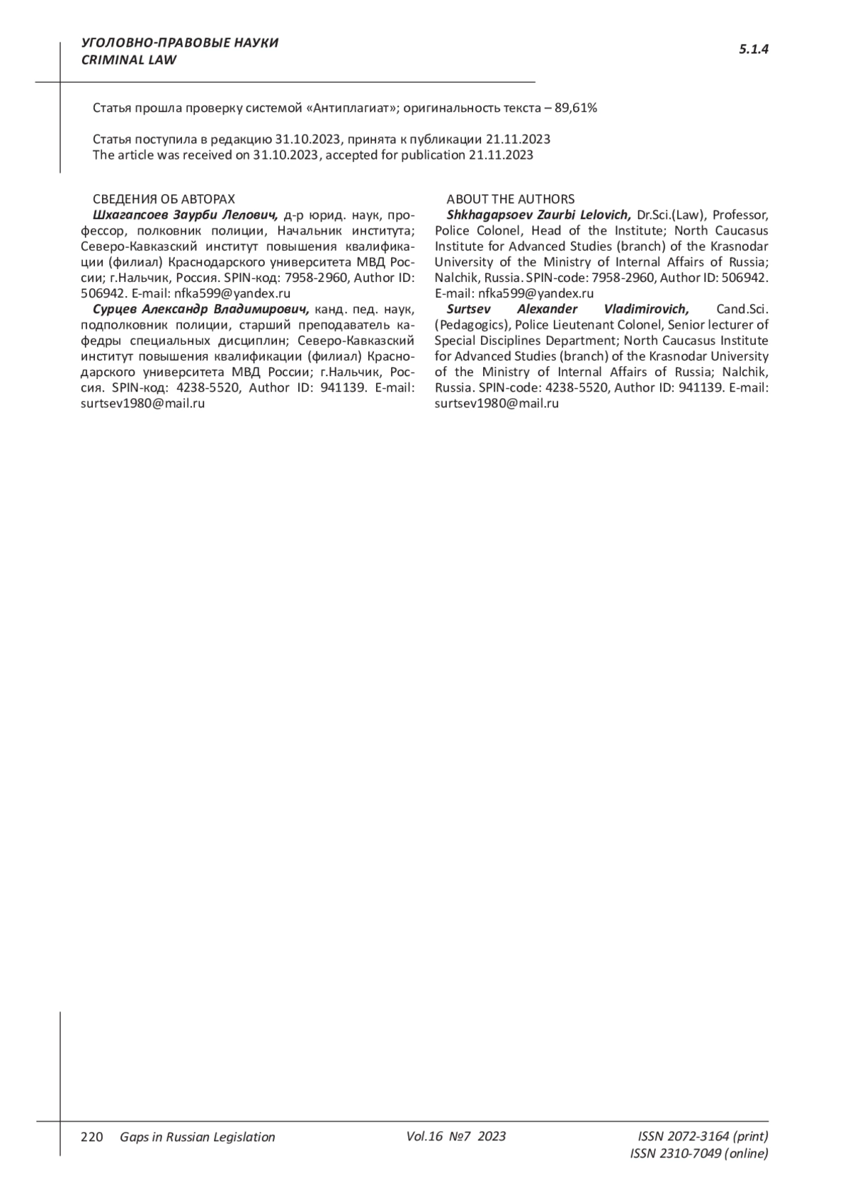 7. Краткая характеристика состояния преступности в Российской Федерации за январь - август 2023 года URL: https://MVD.RF/reports/item/41741442// (дата обращения 12.10.2023 г.).