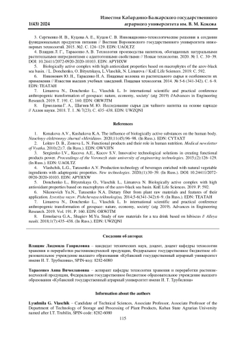 В современном мире образ жизни и рацион населения в значительной степени изменился. Такие изменения повлияли и на здоровье, выносливость, трудоспособность и эмоциональное состояние людей. В первую очередь на состояние здоровья людей влияет пищевой рацион, поскольку с пищей человек потребляет все необходимые и жизненно важные микро- и макроэлементы. Антиоксидантные фенольные соединения и пектиновые вещества растений привлекают все больше внимания в качестве объекта исследования, так как они обладают антиоксидантными и иммуномодулирующими свойствами при регулярном употреблении. В связи с этим целью исследований явилось изучение растительного сырья с повышенными антиоксидантными свойствами, используемого для применения в производстве функциональных напитков. Объекты изучения биологически активных соединений - виноградные выжимки красных сортов винограда и цветки гибискуса. Определены физико-химические показатели сырья, подтверждающие высокое содержание пектиновых веществ в виноградных выжимках, в среднем по сортам - 3,77%, полифенольных веществ - 3227,83 мг/дм3. У гибискуса содержание полифенолов составило 1227,2 мг/дм3. Установленные данные подтверждают технологические свойства сырья для получения экстрактов. Экстракты получали методом кислотного и водного гидролиза. Установлено, что при экстракции потери биологически активных веществ незначительны, органолептическая оценка показала привлекательность экстрактов для будущих напитков. Предложенное сырье можно рекомендовать для производства экстрактов, используемых в качестве основы для напитков с повышенными антиоксидантными и радиопротекторными свойствами.