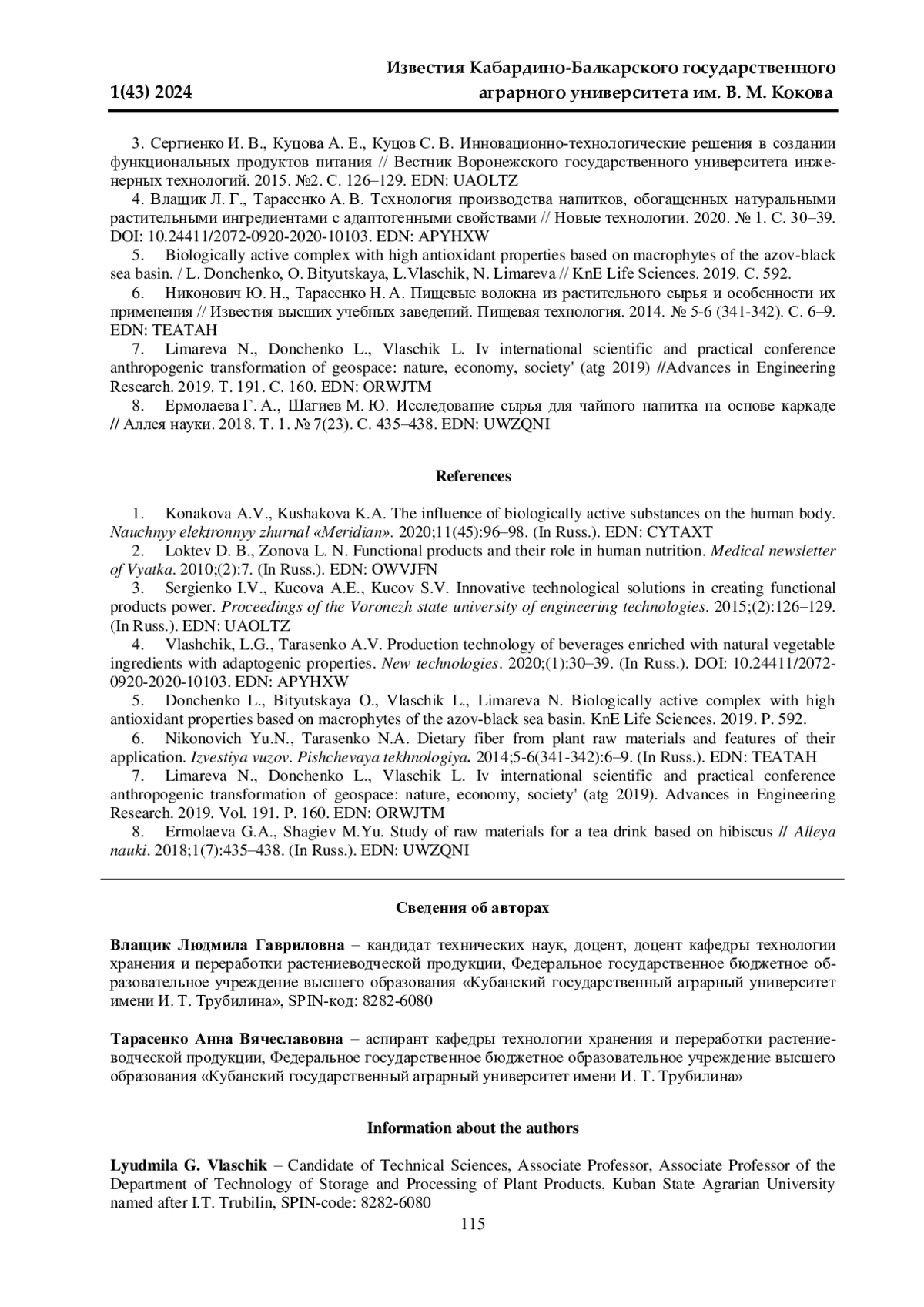 4. Влащик Л. Г., Тарасенко А. В. Технология производства напитков, обогащенных натуральными растительными ингредиентами с адаптогенными свойствами // Новые технологии. 2020. № 1. С. 30-39. DOI: 10.24411/2072-0920-2020-10103 EDN: APYHXW