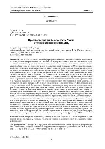 В статье исследованы вопросы формирования системы продовольственной безопасности России в условиях цифровизации АПК. Указано, что агропромышленный комплекс и его вторая сфера - сельское хозяйство - решает жизненно важные социально-экономические задачи развития страны, включая обеспечение необходимого уровня продовольственной безопасности. Отмечено, что сельское хозяйство подвержено негативному влиянию целого ряда факторов: природно-климатических, экономических, финансовых, демографических, политических и др. Все это в значительной степени повышает риск-нагрузку, ведет к снижению устойчивости как сельскохозяйственного производства, так и системы продовольственной безопасности. Сложившаяся ситуация характеризуется жесткой конкуренцией, снижением инвестиций в основной капитал сельскохозяйственных организаций, необходимостью оперативного решения задач импортозамещения, достижения технологического суверенитета и т. п. Решение указанных проблем требует использования новой технологической базы развития. Утверждается, что цифровизация АПК придает определенные особенности процессу формирования системы продовольственной безопасности. Выделены и проанализированы внешние и внутренние условия, формирующие негативный фон развития сельского хозяйства и обеспечения продовольственной безопасности (рост урбанизации, нескоординированное расширение антропогенной деятельности, деградация земли, обезлесивание и т. п.). В статье проведен анализ факторов, непосредственно препятствующих развитию цифровизации в российском АПК (санкционное давление, низкоэффективные механизмы достижения технологического суверенитета, ограничения, связанные с СВО, сложившаяся культура управления, низкая компетенция персонала, зависимость от импортного программного обеспечения, страхи перехода на новые инструменты и т. д.). Отмечено, что цифровизация возводит на новый качественный уровень развитие сельского хозяйства и, как следствие, обеспечение продовольственной безопасности. Сельское хозяйство становится высокотехнологичной отраслью. Цифровые технологии делают сельское хозяйство менее зависимым от климатических условий, позволяют в значительной степени повысить эффективность управления рисками и снижать остроту сопутствующих угроз. Сделан вывод о том, что цифровизация АПК должна осуществляться комплексно, при должной государственной поддержке с разработкой и реализацией стратегии и программ цифровизации АПК.