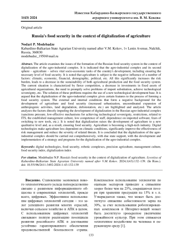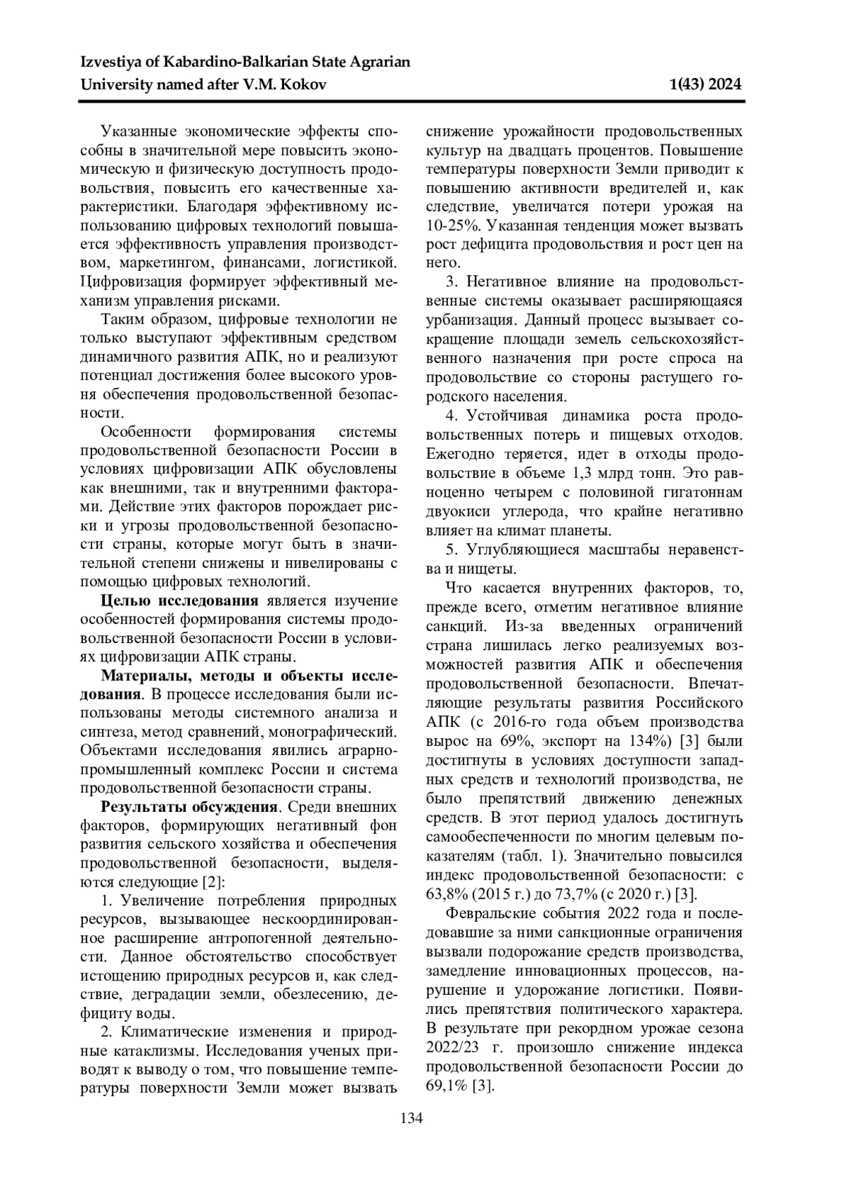 7. Кокова Э. Р. Роль современных технологий в обеспечении продовольственной безопасности регионов // Вестник экспертного совета. 2019. № 1(16). C. 10-14. EDN: OKYNOI