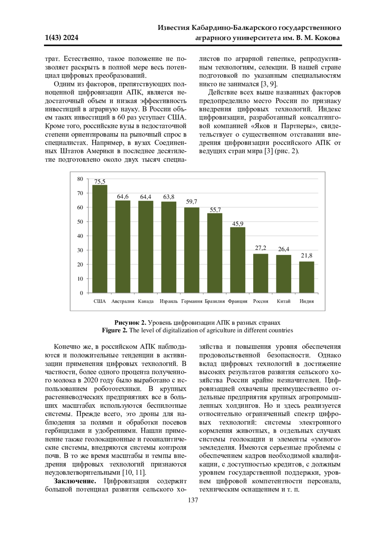 6. Пешкова Г. Ю., Фѐдоров К. Ф. Актуальные тенденции и проблемы цифровизации АПК // Международный научно-исследовательский журнал. 2022. № 4-4 (118). C. 150-153. DOI: 10.23670/IRJ.2022.118.4.139 EDN: HCBWCH