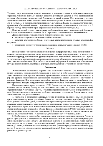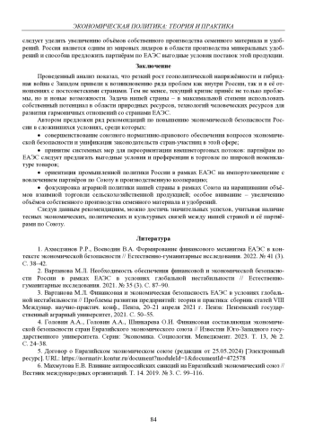 2. Вартанова М.Л. Необходимость обеспечения финансовой и экономической безопасности России в рамках ЕАЭС в условиях глобальной нестабильности // Естественно-гуманитарные исследования. 2021. № 35 (3). С. 87-90. EDN: VTAPKJ