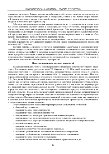 В настоящее время, в условиях сложной геополитической ситуации и санкционных ограничений в технологической сфере производственно-технологическое развитие России требует перехода к новой технологической парадигме, в основе которой лежит развитие в ускоренном темпе собственных передовых технологий, которые помогут преодолеть технологическую отсталость и повысить конкурентоспособность отечественных предприятий. Переориентация фокуса внимания отечественных производителей с использования западных технологий, доступ к которым в условиях жестких санкций против российской промышленности ограничен, на разработку и внедрение высоких технологий, позволит сформировать собственную научнотехнологическую основу высокотехнологичных производств в промышленности России и уйти от сырьевого характера экономики в нашей стране