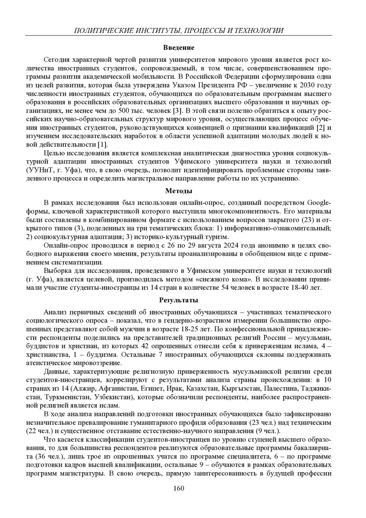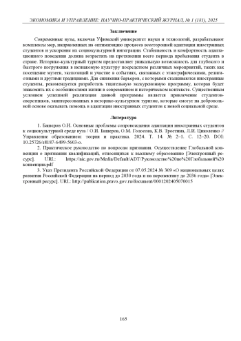 1. Башеров О.И. Основные проблемы сопровождения адаптации иностранных студентов к социокультурной среде вуза / О.И. Башеров, О.М. Голосова, К.В. Тростина, Л.И. Циколенко // Управление образованием: теория и практика. 2024. Т. 14. № 2-1. С. 12-20. DOI: 10.25726/s8187-6499-5603-o EDN: NWCMDS