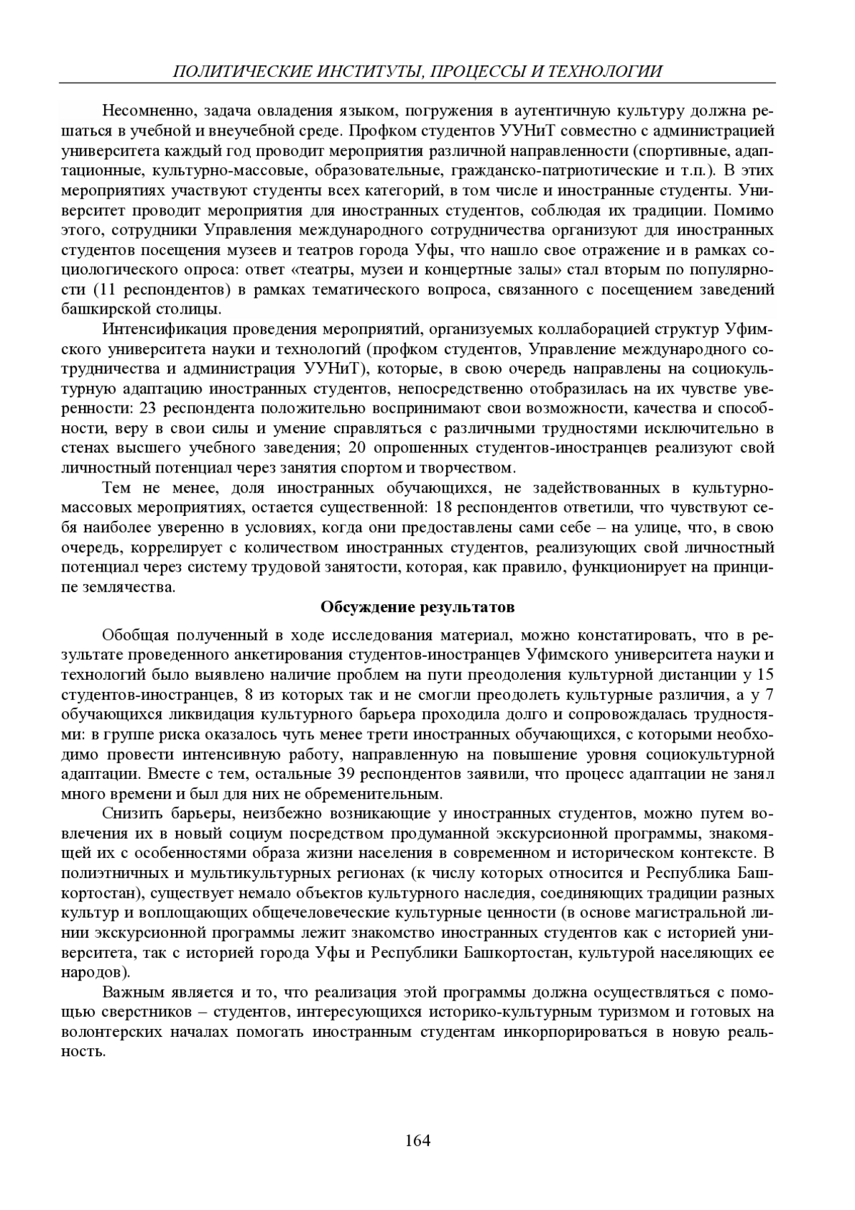 В статье представлена оценка уровня социокультурной адаптации иностранных студентов Уфимского университета науки и технологий, основанная на применении широкого спектра показателей, позволяющих познакомиться с опытом вуза в данной сфере. Системный подход позволил комплексно оценить имеющийся задел и предложить пути для дальнейшей оптимизации процесса социокультурной адаптации иностранных обучающихся на основе использования потенциала историко-культурного туризма.