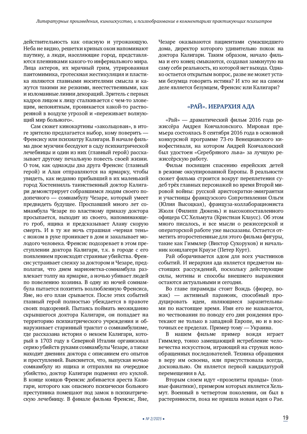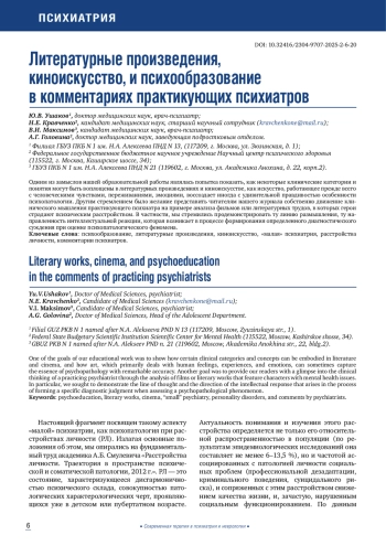 Одним из замыслов нашей образовательной работы являлась попытка показать, как некоторые клинические категории и понятия могут быть воплощены в литературных произведениях и киноискусстве, как искусство, работающее прежде всего с человеческими чувствами, переживаниями, эмоциями, воссоздает иногда с удивительной правдивостью особенности психопатологии. Другим стремлением было желание представить читателям нашего журнала собственно движение клинического мышления практикующего психиатра на примере анализа фильмов или литературных трудов, в которых герои страдают психическим расстройством. В частности, мы стремились продемонстрировать ту линию размышления, ту направленность интеллектуальной реакции, которая возникает в процессе формирования определенного диагностического суждения при оценке психопатологического феномена.