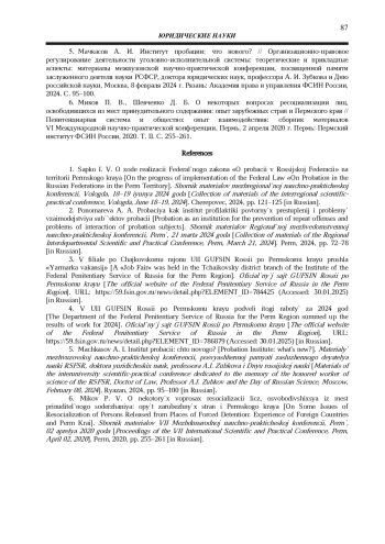 5. Мачкасов А. И. Институт пробации: что нового? // Организационно-правовое регулирование деятельности уголовно-исполнительной системы: теоретические и прикладные аспекты: материалы межвузовской научно-практической конференции, посвященной памяти заслуженного деятеля науки РСФСР, доктора юридических наук, профессора А. И. Зубкова и Дню российской науки, Москва, 8 февраля 2024 г. Рязань: Академия права и управления ФСИН России, 2024. С. 95-100. EDN: QHGCVH