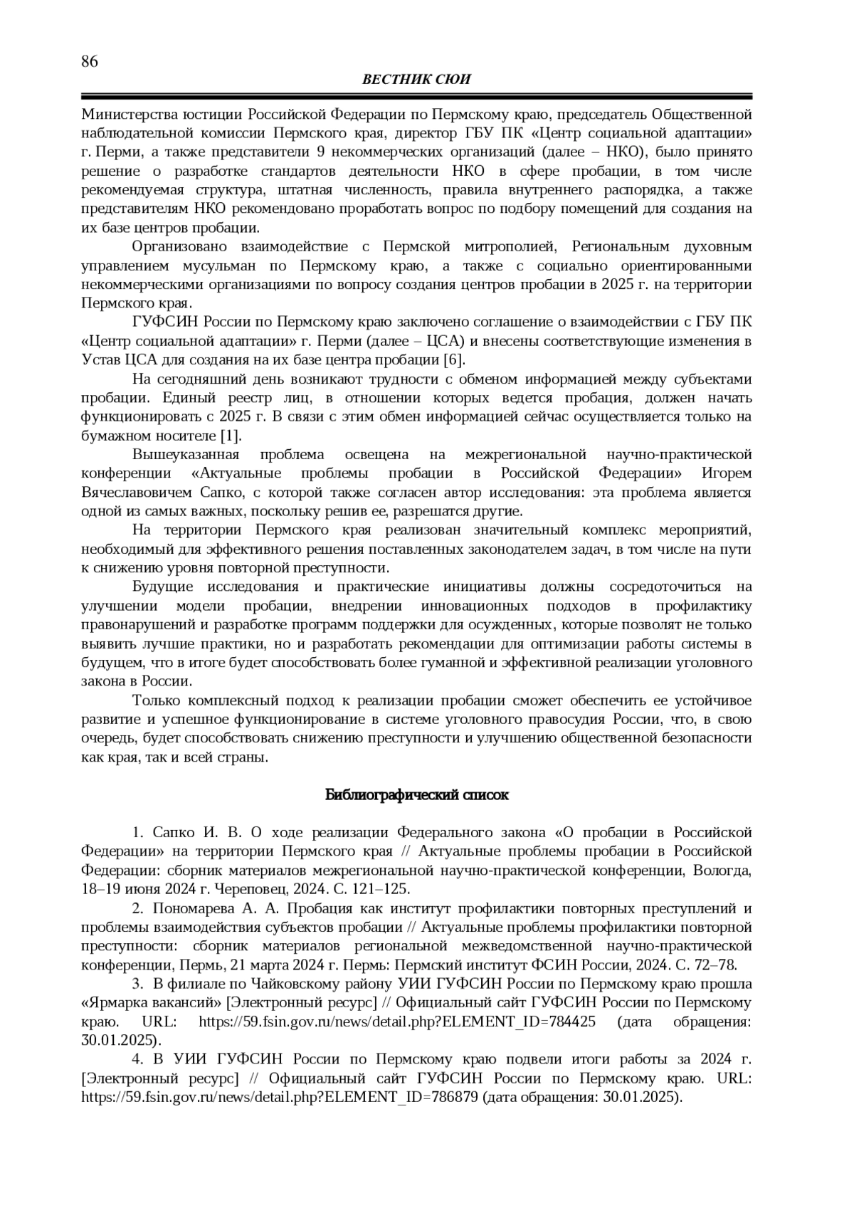 4. В УИИ ГУФСИН России по Пермскому краю подвели итоги работы за 2024 г. [Электронный ресурс] // Официальный сайт ГУФСИН России по Пермскому краю. URL: https://59.fsin.gov.ru/news/detail.php?ELEMENT_ID=786879 (дата обращения: 30.01.2025).
