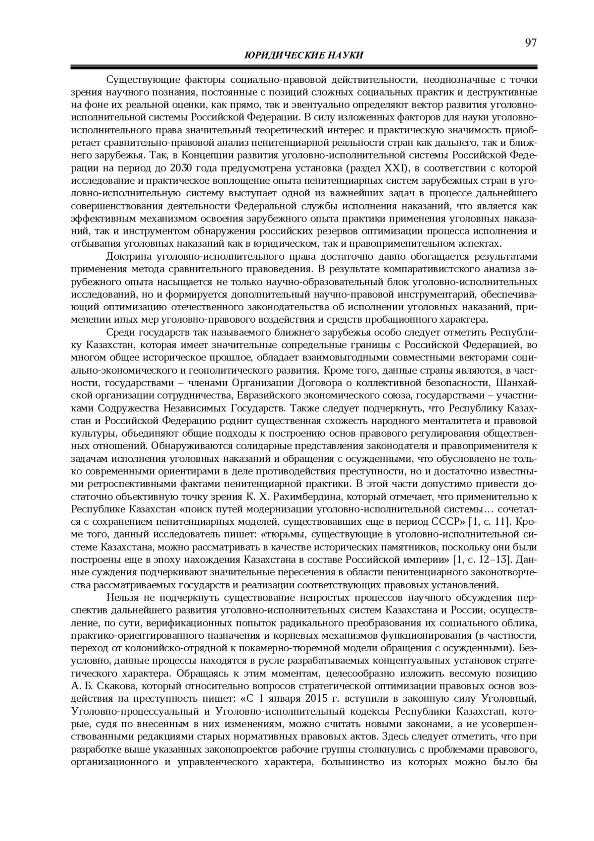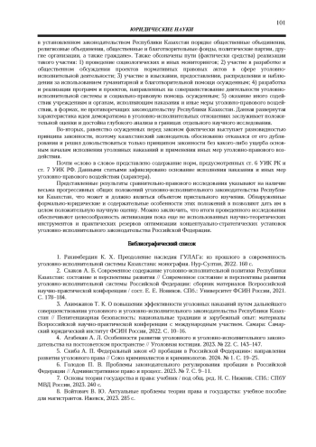 2. Скаков А. Б. Современное содержание уголовно-исполнительной политики Республики Казахстан: состояние и перспективы развития // Современное состояние и перспективы развития уголовно-исполнительной системы Российской Федерации: сборник материалов Всероссийской научно-практической конференции / сост. Е. Е. Новиков. СПб.: Университет ФСИН России, 2021. С. 178-184. EDN: PJOYCR