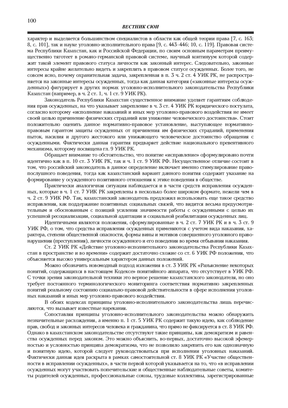Обнаружены как схожие, так и отличительные особенности рассматриваемых отправных положений уголовно-исполнительного законодательства двух стран. Например, в УИК РК не содержится общих установлений относительно структуры и содержания уголовно-исполнительного законодательства, что имеет место в ст. 2 УИК РФ.
