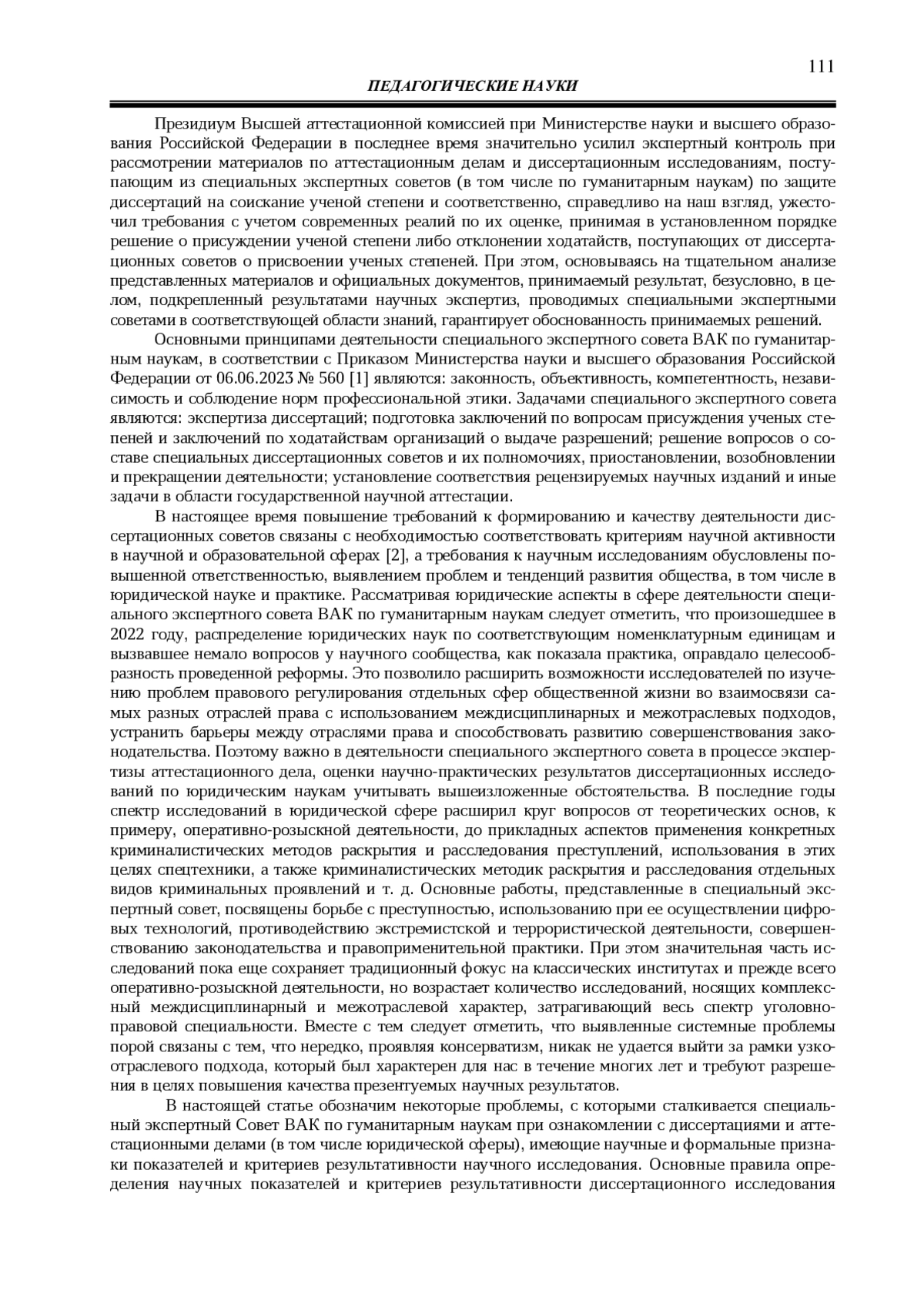 Президиум Высшей аттестационной комиссией при Министерстве науки и высшего образования Российской Федерации в последнее время значительно усилил экспертный контроль при рассмотрении материалов по аттестационным делам и диссертационным исследованиям, поступающим из специальных экспертных советов (в том числе по гуманитарным наукам) по защите диссертаций на соискание ученой степени и соответственно, справедливо на наш взгляд, ужесточил требования с учетом современных реалий по их оценке, принимая в установленном порядке решение о присуждении ученой степени либо отклонении ходатайств, поступающих от диссертационных советов о присвоении ученых степеней.