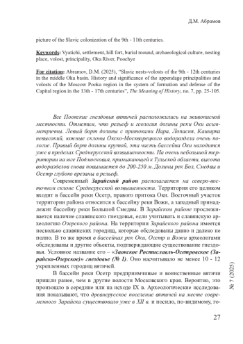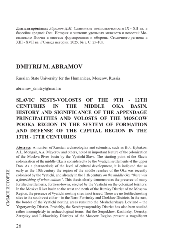 Ряд отечественных археологов и ученых, таких как Б. А. Рыбаков, А. Л. Монгайт, А. А. Майоров и др., отметили важную особенность колонизации бассейна Москвы-реки славянами-вятичами. Исходным пунктом славянской колонизации средней Оки рассматриваются вятические поселения верхнего Дона. В качестве характеристики уровня культурного развития указывается, что еще в X в. район среднего течения Оки был недавно колонизирован вятичами, а уже в XI в. на средней Оке «наблюдался расцвет городской культуры». Данный тезис ярко свидетельствует о наличии множества укрепленных городищ, крепостей-градов, воздвигнутых вятичами на колонизируемой территории. В бассейне Москвы-реки западнее и севернее Рузского района Московской области наличие гнездовий вятичей не прослеживается. Нет укрепленных гнездовий и юго-западнее – в Наро-Фоминском и Чеховском районах. На востоке граница гнездовий вятичей упирается в Мещерскую низменность – Егорьевский район. Вероятно, и Серебрянопрудский район в археологическом отношении изучен довольно неполно. Но Серпуховской, Каширский, Озерский, Зарайский и Луховицкий районы Московской области представляют великолепную картину славянской колонизации IX - XI вв.