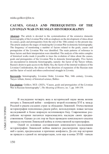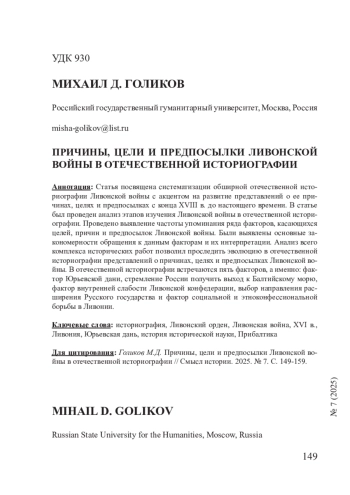 Статья посвящена систематизации обширной отечественной историографии Ливонской войны с акцентом на развитие представлений о ее причинах, целях и предпосылках с конца XVIII в. до настоящего времени. В статье был проведен анализ этапов изучения Ливонской войны в отечественной историографии. Проведено выявление частоты упоминания ряда факторов, касающихся целей, причин и предпосылок Ливонской войны. Были выявлены основные закономерности обращения к данным факторам и их интерпретации. Анализ всего комплекса исторических работ позволил проследить эволюцию в отечественной историографии представлений о причинах, целях и предпосылках Ливонской войны. В отечественной историографии встречаются пять факторов, а именно: фактор Юрьевской дани, стремление России получить выход к Балтийскому морю, фактор внутренней слабости Ливонской конфедерации, выбор направления расширения Русского государства и фактор социальной и этноконфессиональной борьбы в Ливонии.