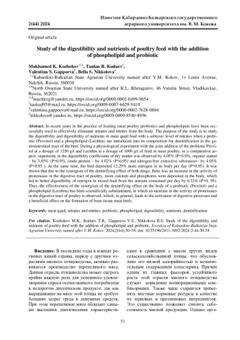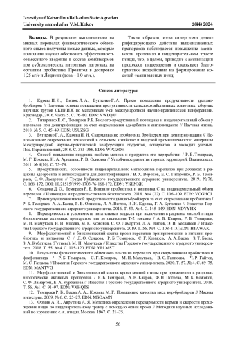12. Темираев Р. Б., Баева А. А., Кокаева М. Г. Повышение качества мяса кур-бройлеров // Мясная индустрия. 2009. № 6. С. 25-27. EDN: MSOAMN 13. Фомин А. И., Аврутина А. Я. Методика определения переваримости кормов и скорости прохождения пищи по пищеварительному тракту с помощью окиси хрома // Методики научных исследований по кормлению с.-х. птицы. Москва. 1967. С. 21-25.
