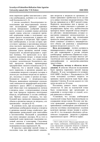 В практике кормления мясной птицы за последние годы для эффективной элиминации нитратов и нитритов из организма успешно применяют пробиотики и фосфолипиды. Цель исследования - изучить переваримость и усвояемость питательных веществ комбикорма мясных перепелов с субтоксическим уровнем содержания нитратов при введении в его состав пробиотика (Провитол) и фосфолипида (Лецитин) для денитрификации в желудочно-кишечном тракте птицы. В ходе физиологического опыта при совместных добавках пробиотика Провитол в дозировке 1250 г/т и Лецитина в дозировке 1000 г/т корма у мясной птицы в сравнительном аспекте наблюдалось превосходство по коэффициентам переваримости сухого вещества на 4,05% (P>0,95), органического вещества - на 3,85% (P>0,95), сырого протеина - на 4,02% (P>0,95) и безазотистых экстрактивных веществ - на 4,05% (P>0,95). При этом у птицы за сутки откладывалось в теле больше азота на 12,29% (Р>0,95). Показано, что из-за синергизма денитрифицирующего действия обоих препаратов наблюдалось повышение активности протеиназ в пищеварительном тракте птицы, откладывалось в организме больше кальция и фосфора, что привело к лучшей усвояемости азота комбикормов от потребленного за сутки количества на 6,33% (Р>0,95). Таким образом, научно обоснована эффективность синергизма денитрифицирующего действия на организм пробиотика (Провитол) и фосфолипида (Лецитин), при котором наблюдается повышение активности протеиназ в пищеварительном тракте птицы, что, в целом, приводит к активизации процессов пищеварения и оказанию благоприятного воздействия на формирование костной ткани мясных птиц.